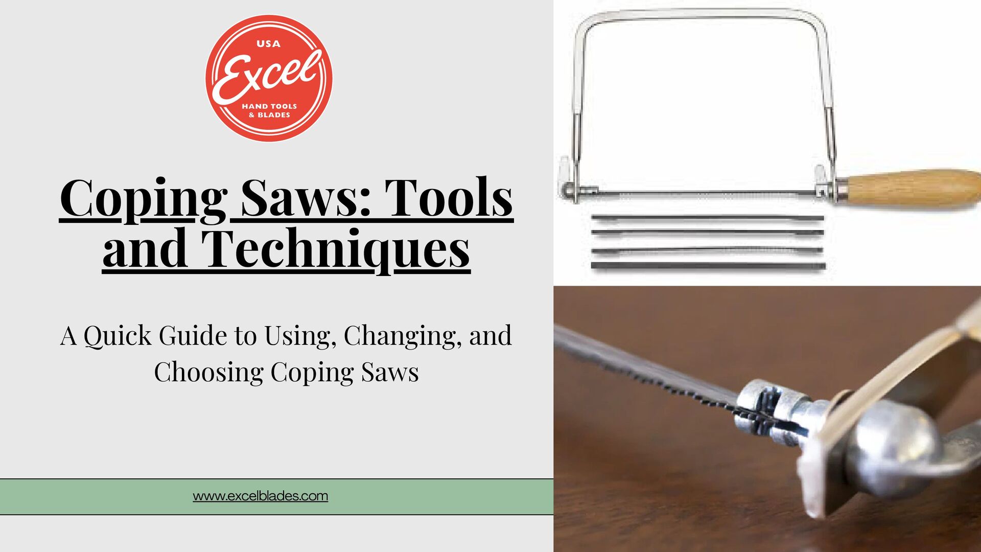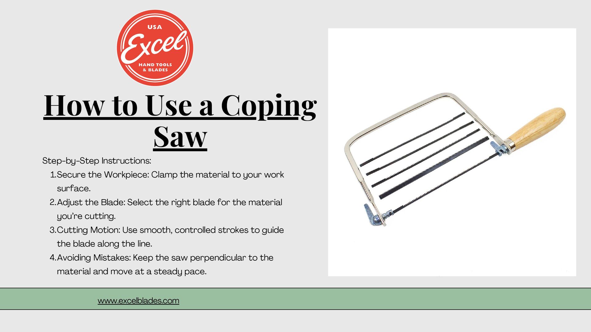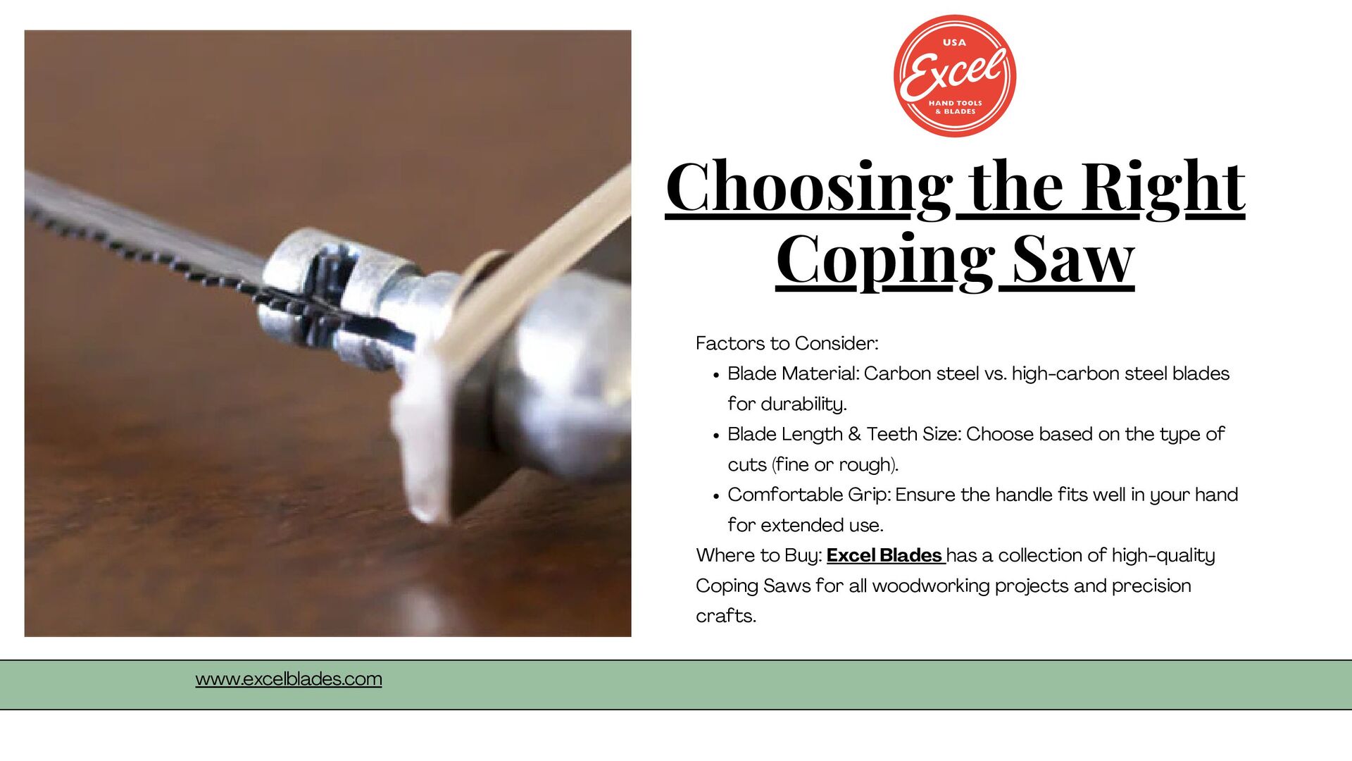 Carbon steel vs. high-carbon steel blades for durability. Blade Length & Teeth Size: Choose based on the type of cuts (fine or rough). Comfortable Grip: Ensure the handle fits well in your hand for extended use. Where to Buy: Excel Blades has a collection of high-quality Coping Saws for all woodworking projects and precision crafts. www.excelblades.com