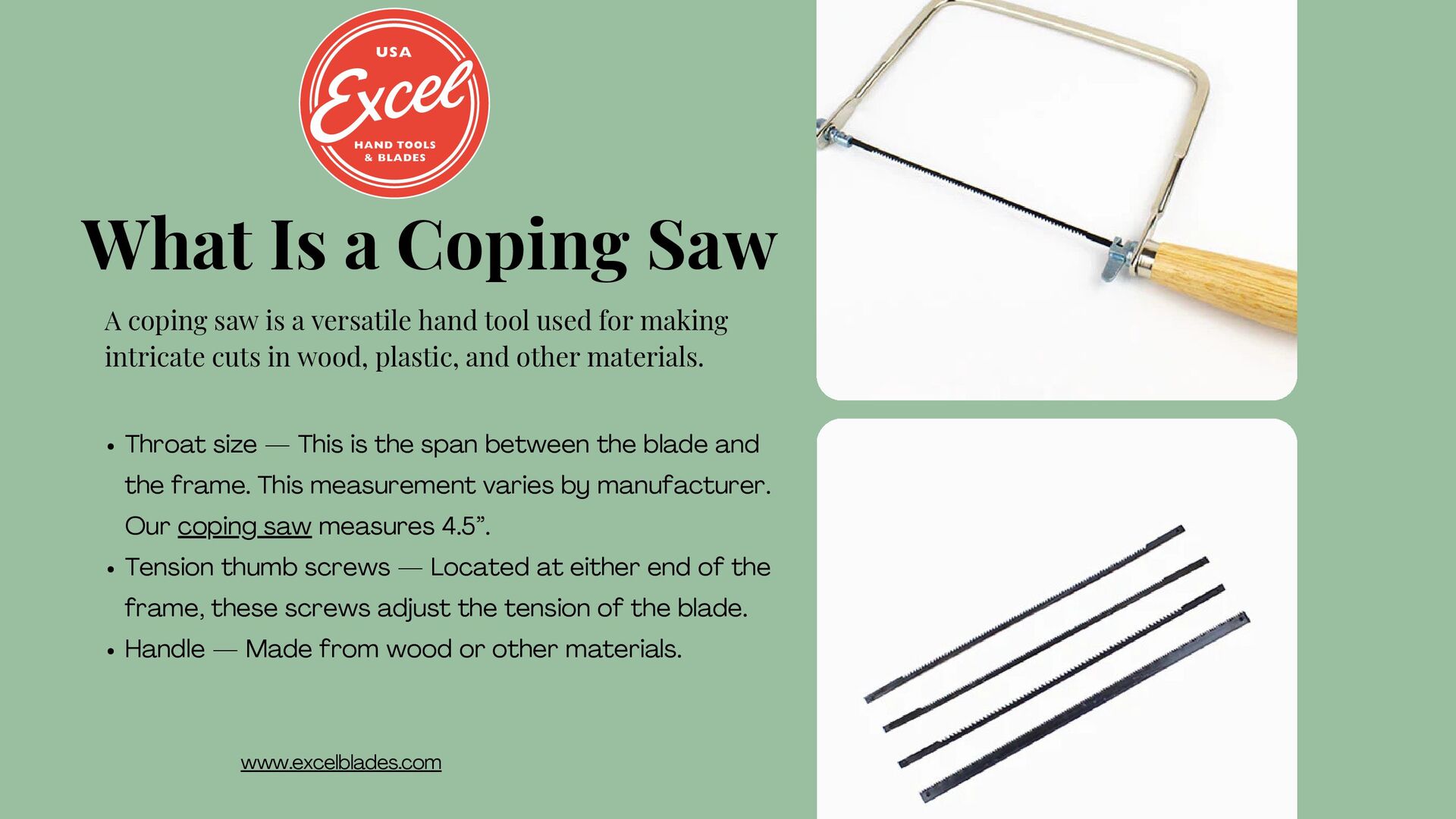 versatile hand tool used for making intricate cuts in wood, plastic, and other materials. Throat size — This is the span between the blade and the frame. This measurement varies by manufacturer. Our coping saw measures 4.5”. Tension thumb screws — Located at either end of the frame, these screws adjust the tension of the blade. Handle — Made from wood or other materials. www.excelblades.com