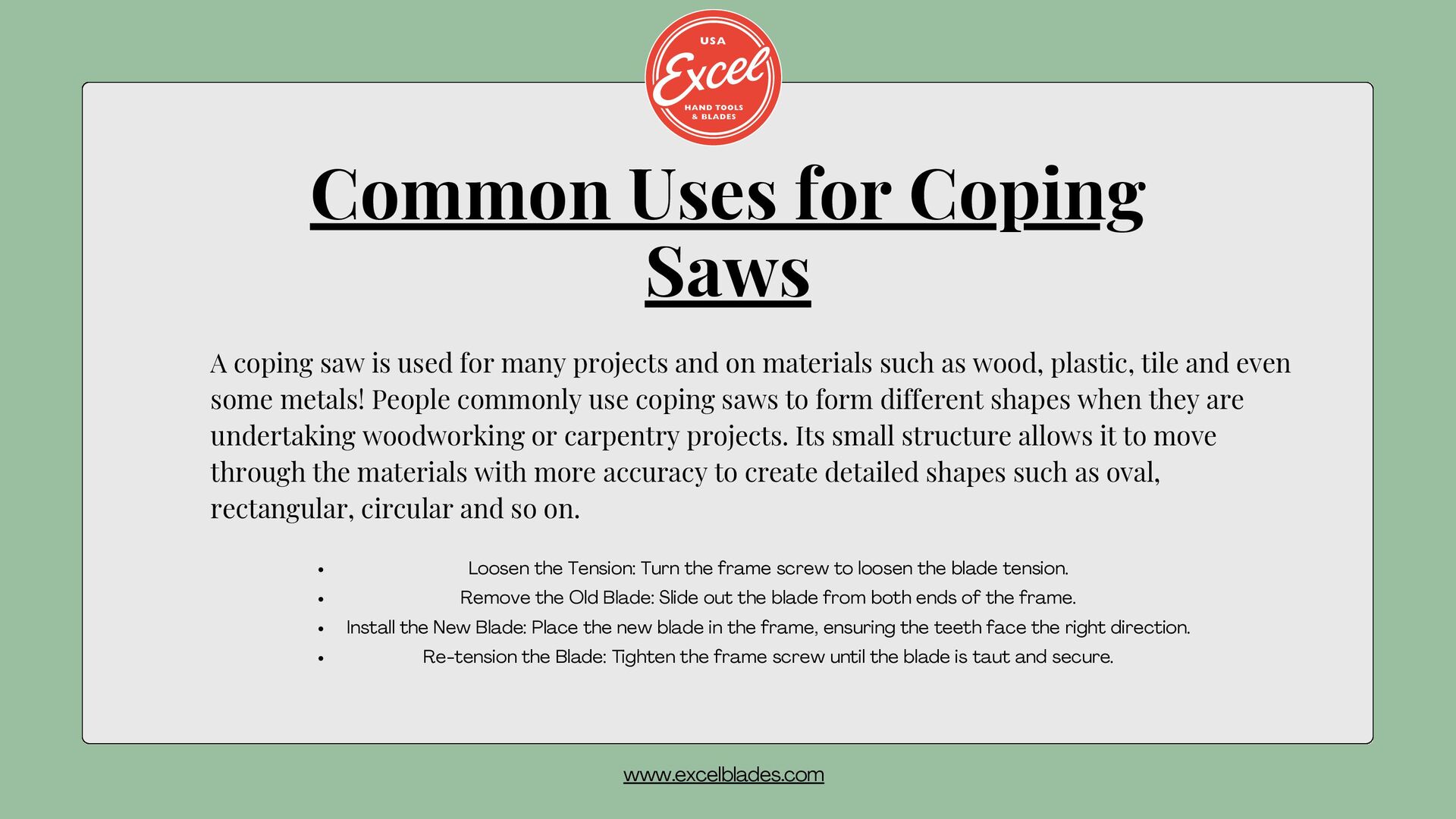 materials such as wood, plastic, tile and even some metals! People commonly use coping saws to form different shapes when they are undertaking woodworking or carpentry projects. Its small structure allows it to move through the materials with more accuracy to create detailed shapes such as oval, rectangular, circular and so on. Common Uses for Coping Saws Loosen the Tension: Turn the frame screw to loosen the blade tension. Remove the Old Blade: Slide out the blade from both ends of the frame. Install the New Blade: Place the new blade in the frame, ensuring the teeth face the right direction. Re-tension the Blade: Tighten the frame screw until the blade is taut and secure. www.excelblades.com