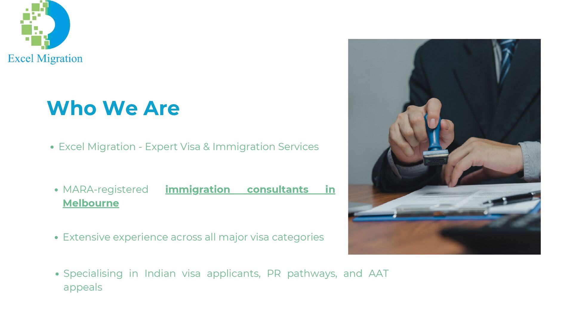 At Excel Migration, we offer expert immigration and visa services tailored to your needs. Based in Melbourne, our experienced consultants provide personalised guidance for student, partner, skilled, and employer-sponsored visas. With a client-first approach, we simplify complex migration processes and help you achieve your Australian residency goals with confidence. https://www.excelmigration.com.au