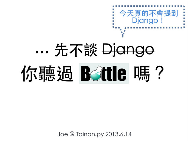 Official Website: http://bottlepy.org/docs/stable/ Related Blog Post: http://joe-dev.blogspot.tw/2013/03/taipeipy-2013-3.html