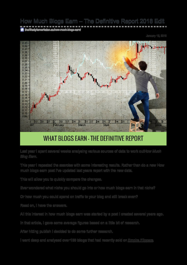 Report 2018 Edit thelifestylemarketer.co/how-much-blogs-earn/ Last year I spent several weeks analysing various sources of data to work out How Much Blog Earn. This year I repeated the exercise with some interesting results. Rather than do a new How much blogs earn post I’ve updated last years report with the new data. This will allow you to quickly compare the changes. Ever wondered what niche you should go into or how much blogs earn in that niche? Or how much you could spend on traffic to your blog and still break even? Read on, I have the answers. All this interest in how much blogs earn was started by a post I created several years ago. In that article, I gave some average figures based on a little bit of research. After hitting publish I decided to do some further research. I went deep and analysed over 100 blogs that had recently sold on Empire Flippers. 1/15