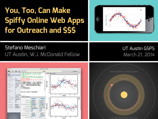 the webpage: http://www.stefanom.org/systemic-live/ • “51 Pegged: Rediscovering the First Exoplanet” • “A Fish in a Barrel — HD 4208b” • “The Ups and Downs of Ups And” • ...and others I’m also working to connect existing exoplanet “databases” (exoplanet.eu, exoplanet.org, etc.) with Systemic, so that with a click you can access and analyze the data associated with a system.
