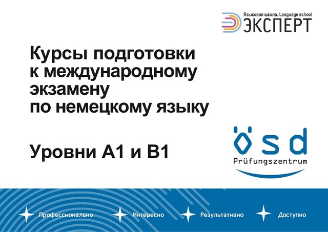 ALTE (The Association of Language Testers in Europe) – Ассоциацию языкового тестирования в Европе – наряду с такими экзаменами как Cambridge English Language Assessment, ESOL и TESOL , TestDaF-Institut, Goethe-Institut ➢ Экзамен в «Эксперте» проводится несколько раз в год: весной, летом, осенью и зимой ➢ Экзамен А1: можно сдавать или пересдавать отдельно устную (Sprechen) часть или письменную (включает модули Lesen, Hören, Schreiben) ➢ Экзамен В1: можно сдавать / пересдавать каждый из модулей Sprechen, Lesen, Hören, Schreiben по отдельности ➢ Экзаменаторы – штатные педагоги «Эксперта», прошедшие соответствующую аттестацию в центральном экзаменационном центре ӦSD , независимые специалисты экзаменационного центра ӦSD из Вены и Москвы ➢ Все работы проверяются в Австрии ➢ Если вы планируете переезд в Германию, воспользовавшись статусом позднего переселенца, параграф 7, то вам необходимо подтвердить знание немецкого языка именно на уровне А1; если параграф 4 – уровень В1 ➢ Сертификат бессрочный Языковая школа. Language school