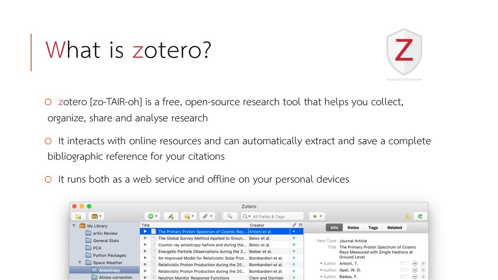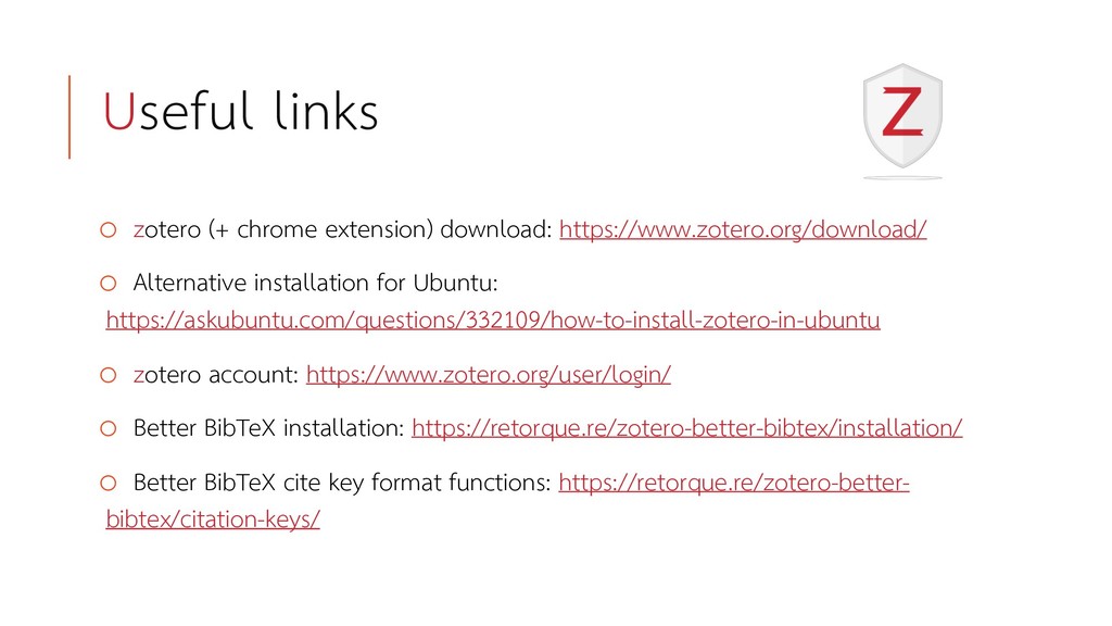 or explorer o Sometimes it cannot get all of the item’s metadata o Make sure that all of the metadata you want is in the item info panel, otherwise you can add it manually o Sometime the default BibTeX file can include characters that LaTex doesn’t like o It generates automatic citation keys which may clash with your existing preference – the style is: [author surname]_[title first word/phrase]_[year] o There’s a fix for this with the Better BibTeX add-on