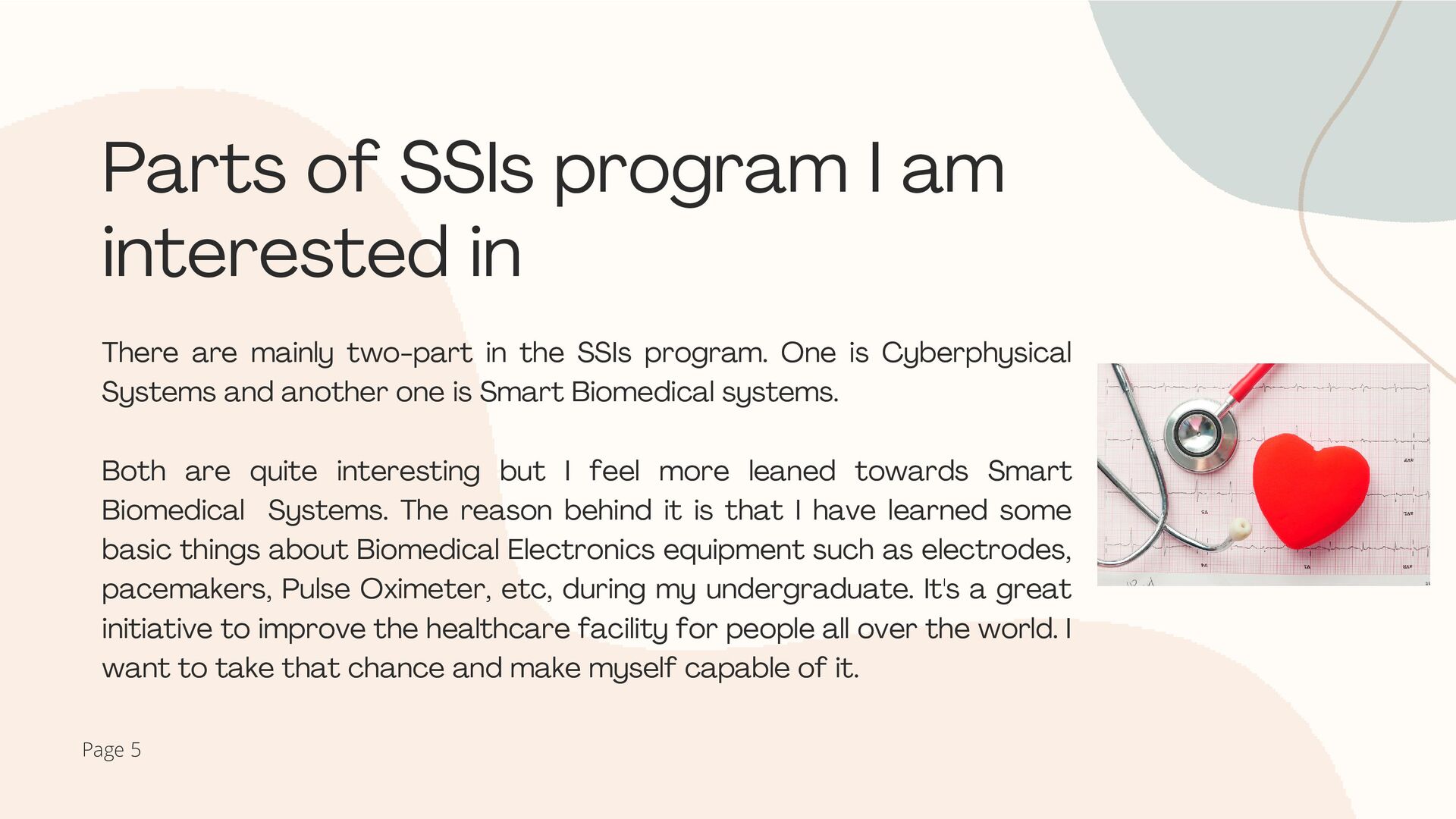 I along with my team members carried out a project on “Design & Implementation of Vertical Surface Climbing Cleaner Robot” under my leadership. During this project, I got acquainted with computer programming and was able to apply my theoretical learning to the practical field. I studied how to use various applications of microprocessors to interact with the robot and human commands. I learned and implemented a cleaning system with my robot to make it productive. I was also able to publish a paper “Design & Implementation of Vertical Surface Climbing Cleaner Robot” in International Conference on Intelligent Technologies (CONIT) Karnataka, India. I was able to develop my leadership as well as pressure handling capabilities. During my undergraduate, I have learned about biomedical equipment as well and felt very enthusiastic on those like Electrodes, pacemakers, etc. Page 4