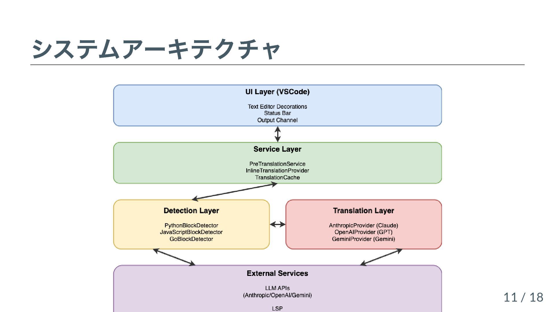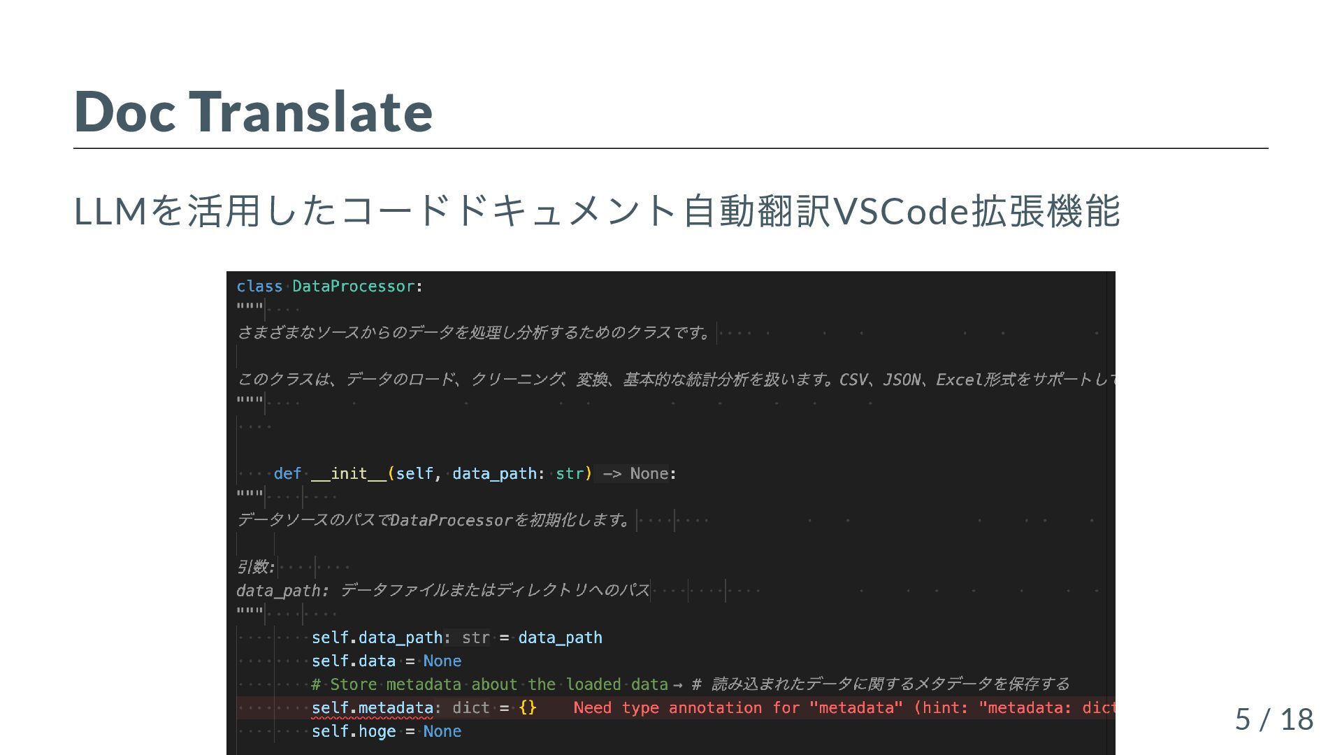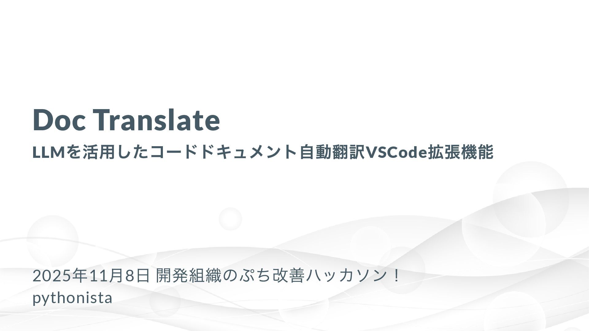 英語と日本語のコメントが混在する社内コードベースやOSSのドキュメントを読む際の認知負荷を軽減するため、LLMを活用した自動翻訳VSCode拡張機能「Doc Translate」を開発しました。