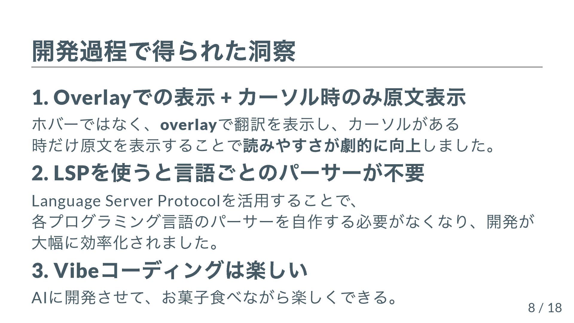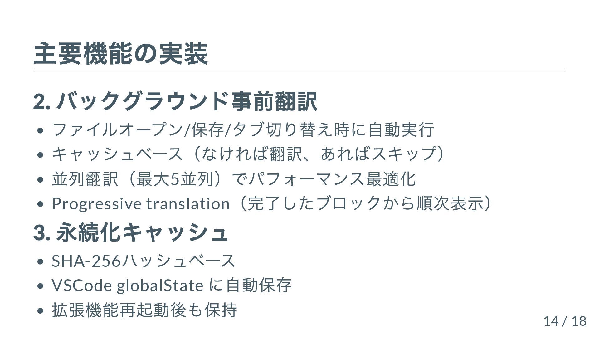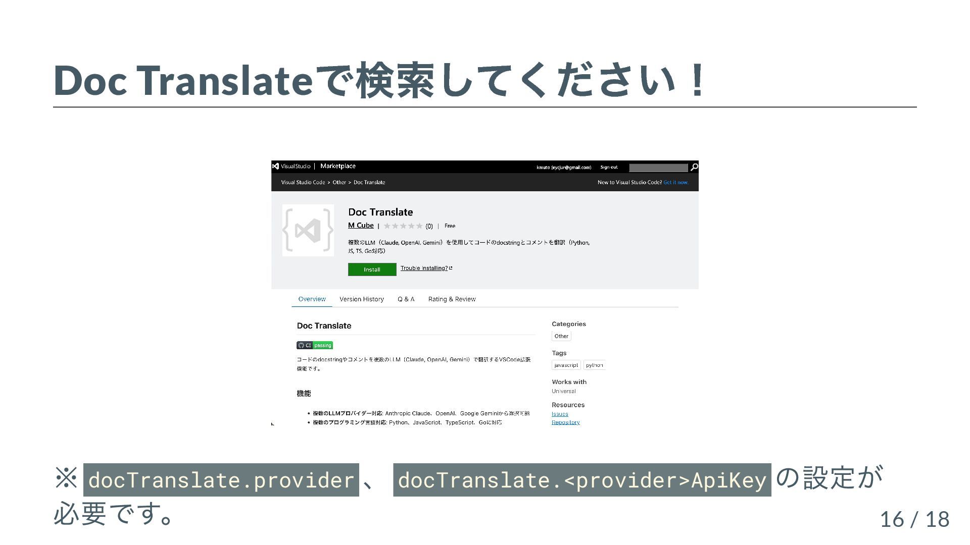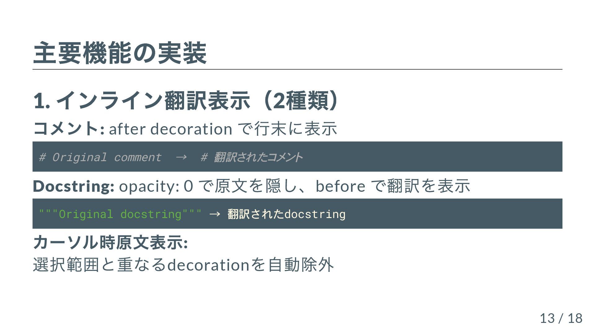 英語と日本語のコメントが混在する社内コードベースやOSSのドキュメントを読む際の認知負荷を軽減するため、LLMを活用した自動翻訳VSCode拡張機能「Doc Translate」を開発しました。