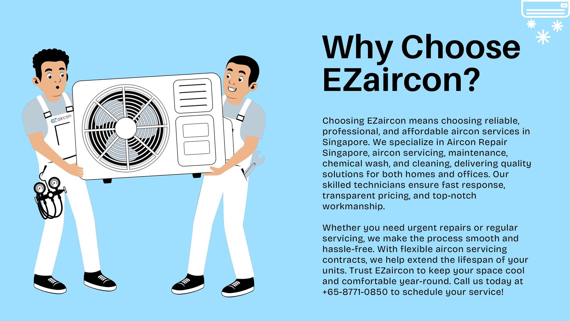 affordable aircon services in Singapore. We specialize in Aircon Repair Singapore, aircon servicing, maintenance, chemical wash, and cleaning, delivering quality solutions for both homes and offices. Our skilled technicians ensure fast response, transparent pricing, and top-notch workmanship. Whether you need urgent repairs or regular servicing, we make the process smooth and hassle-free. With flexible aircon servicing contracts, we help extend the lifespan of your units. Trust EZaircon to keep your space cool and comfortable year-round. Call us today at +65-8771-0850 to schedule your service!