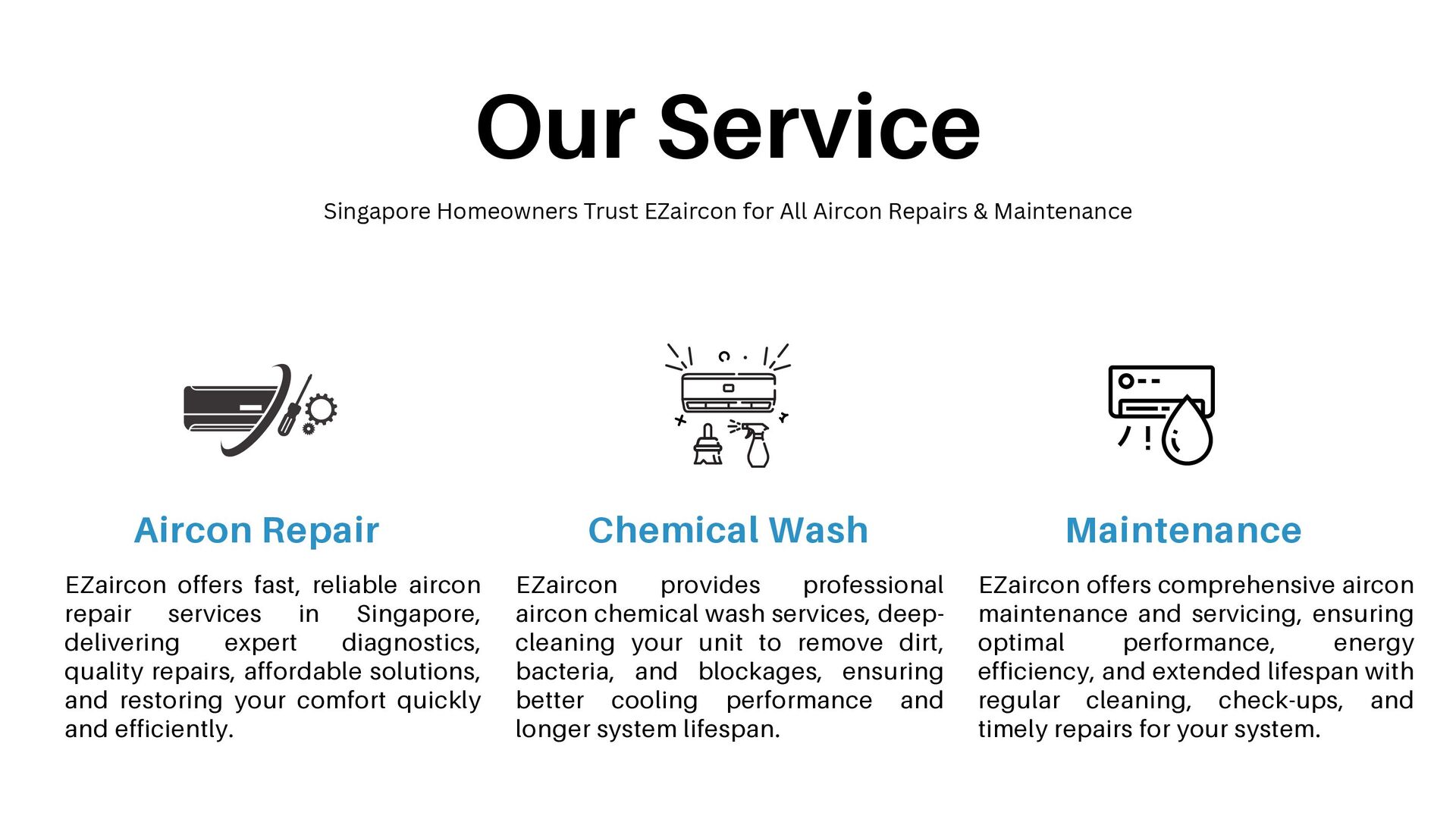 reliable aircon repair services in Singapore, delivering expert diagnostics, quality repairs, affordable solutions, and restoring your comfort quickly and efficiently. EZaircon provides professional aircon chemical wash services, deep- cleaning your unit to remove dirt, bacteria, and blockages, ensuring better cooling performance and longer system lifespan. EZaircon offers comprehensive aircon maintenance and servicing, ensuring optimal performance, energy efficiency, and extended lifespan with regular cleaning, check-ups, and timely repairs for your system. Singapore Homeowners Trust EZaircon for All Aircon Repairs & Maintenance