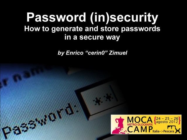 Metro Olografix Hacker Camp 2012 talk about password security from a user and a developer perspective. How to apply a brute force attack using the power of GPUs and how is easy to attack passwords stored using MD5/SHA1 with or without a salt value. We introduced the Pbkdf2, bcrypt, and scrypt algorithms that can be used to store a user’s password with a good security level. We showed some examples of usage using the PHP scripting language.