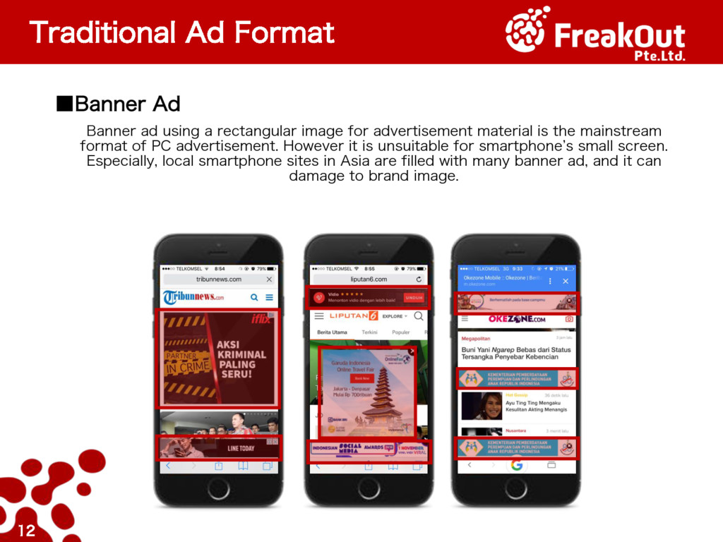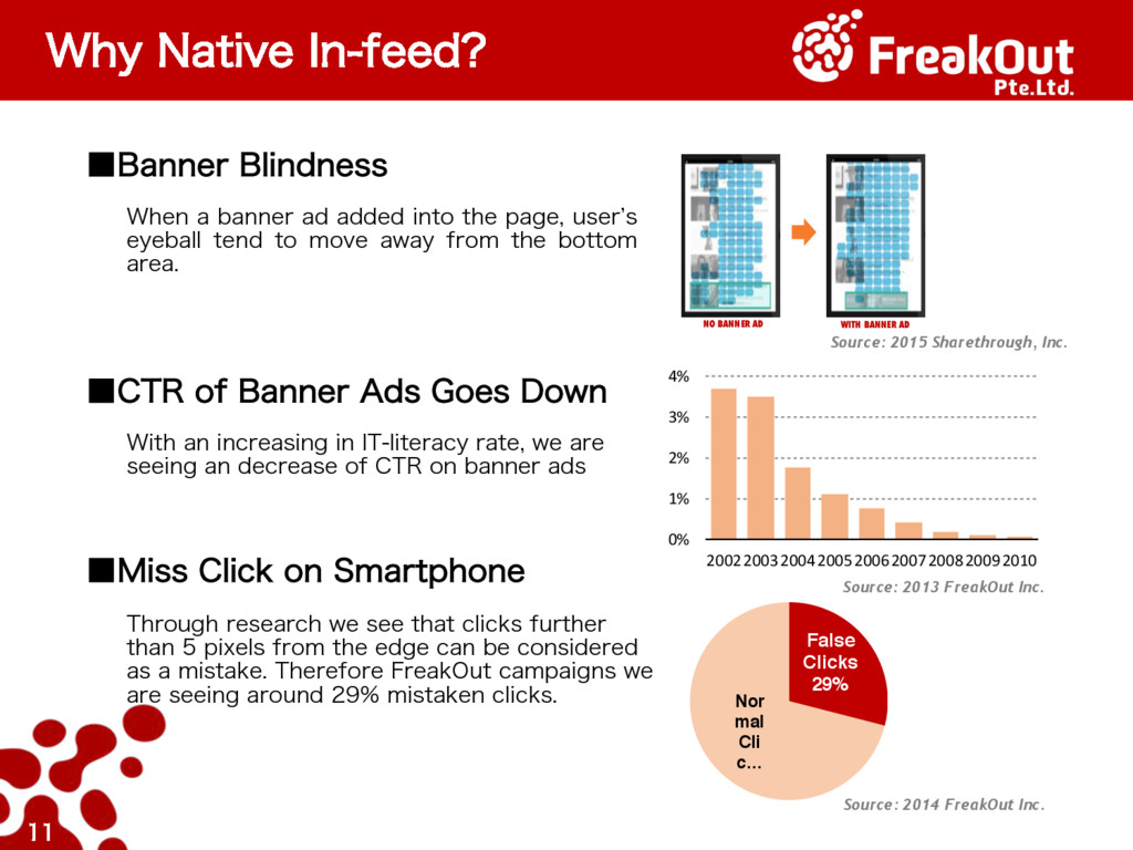 QBHF VTFS`T FZFCBMM UFOE UP NPWF BXBZ GSPN UIF CPUUPN BSFB ˙$53PG#BOOFS"ET(PFT%PXO 8JUIBOJODSFBTJOHJO*5MJUFSBDZSBUF XFBSF TFFJOHBOEFDSFBTFPG$53POCBOOFSBET ˙.JTT$MJDLPO4NBSUQIPOF 5ISPVHISFTFBSDIXFTFFUIBUDMJDLTGVSUIFS UIBOQJYFMTGSPNUIFFEHFDBOCFDPOTJEFSFE BTBNJTUBLF5IFSFGPSF'SFBL0VU DBNQBJHOTXF BSFTFFJOHBSPVOENJTUBLFODMJDLT 0% 1% 2% 3% 4% 200220032004200520062007200820092010 Source: 2013 FreakOut Inc. Source: 2015 Sharethrough, Inc. NO BANNER AD WITH BANNER AD Representative Example of Eye-Tracking Result False Clicks 29% Nor mal Cli c… Source: 2014 FreakOut Inc.