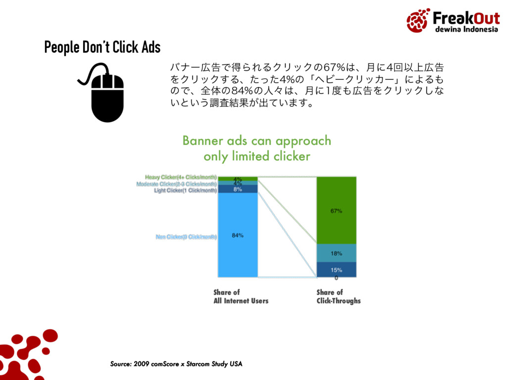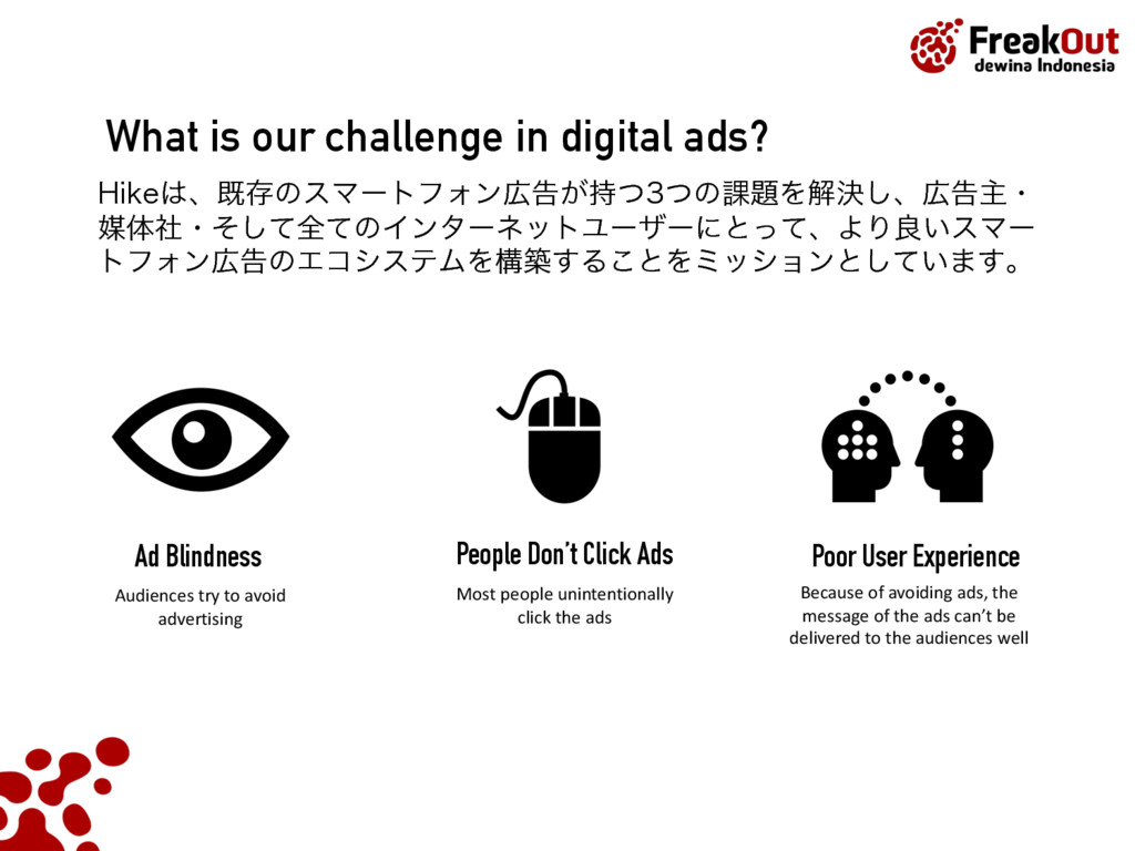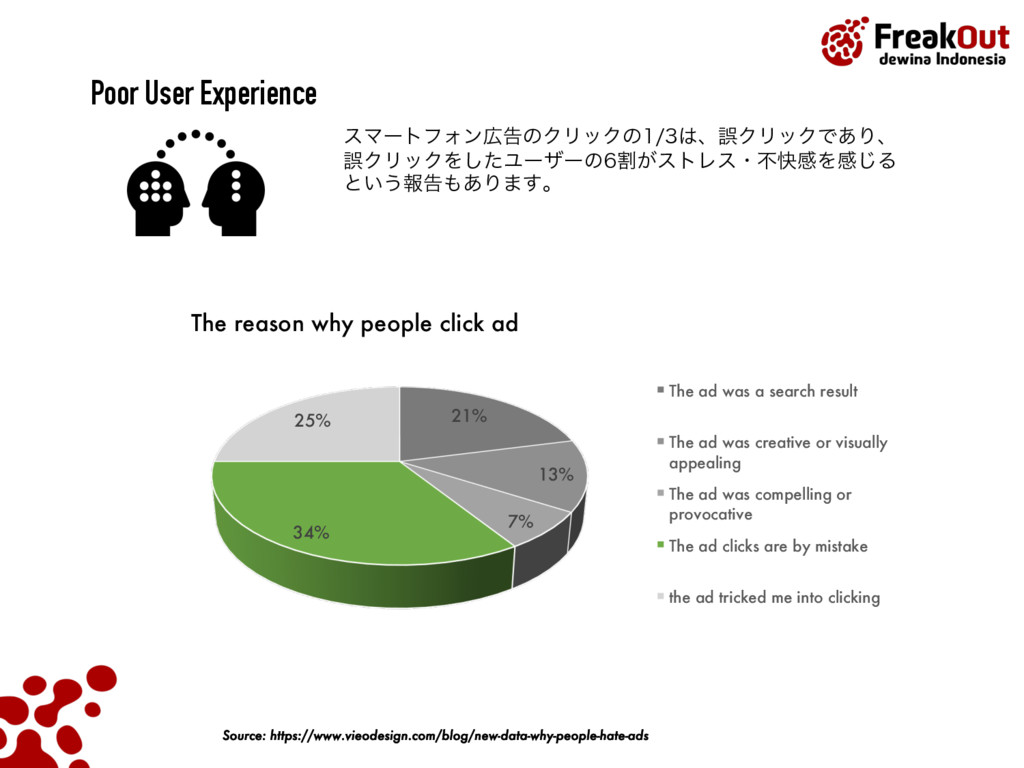 Ad Blindness People Don’t Click Ads Poor User Experience Audiences try to avoid advertising Most people unintentionally click the ads Because of avoiding ads, the message of the ads can’t be delivered to the audiences well