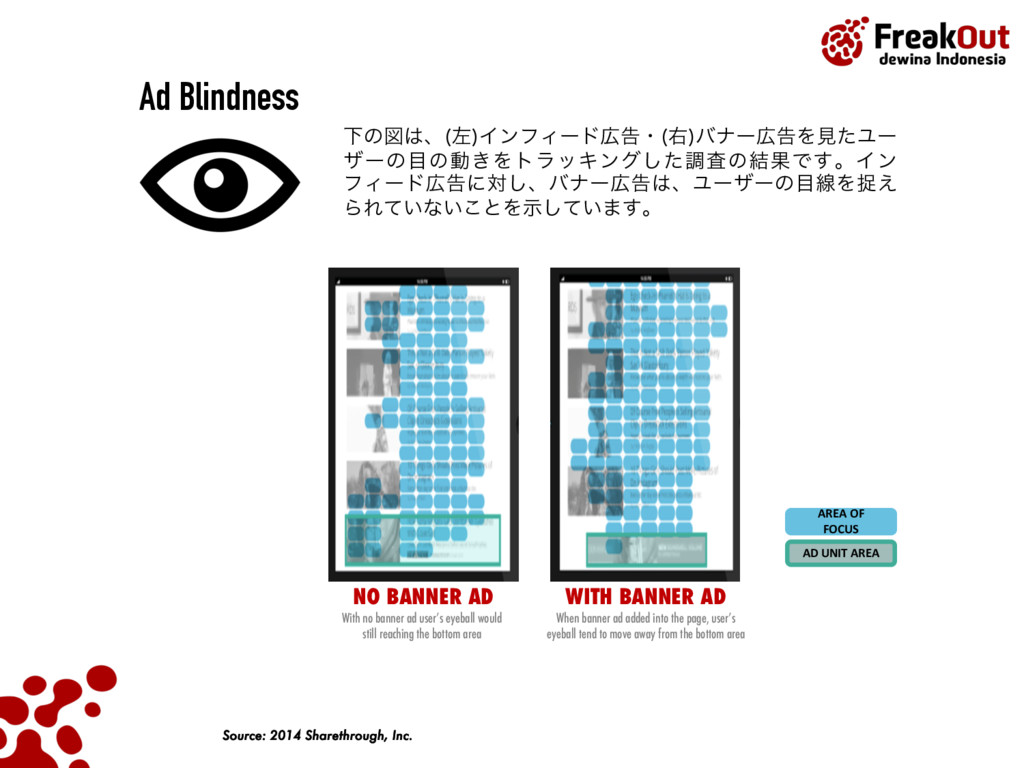 Source: 2014 Sharethrough, Inc. NO BANNER AD WITH BANNER AD With no banner ad user’s eyeball would still reaching the bottom area AREA OF FOCUS AD UNIT AREA When banner ad added into the page, user’s eyeball tend to move away from the bottom area