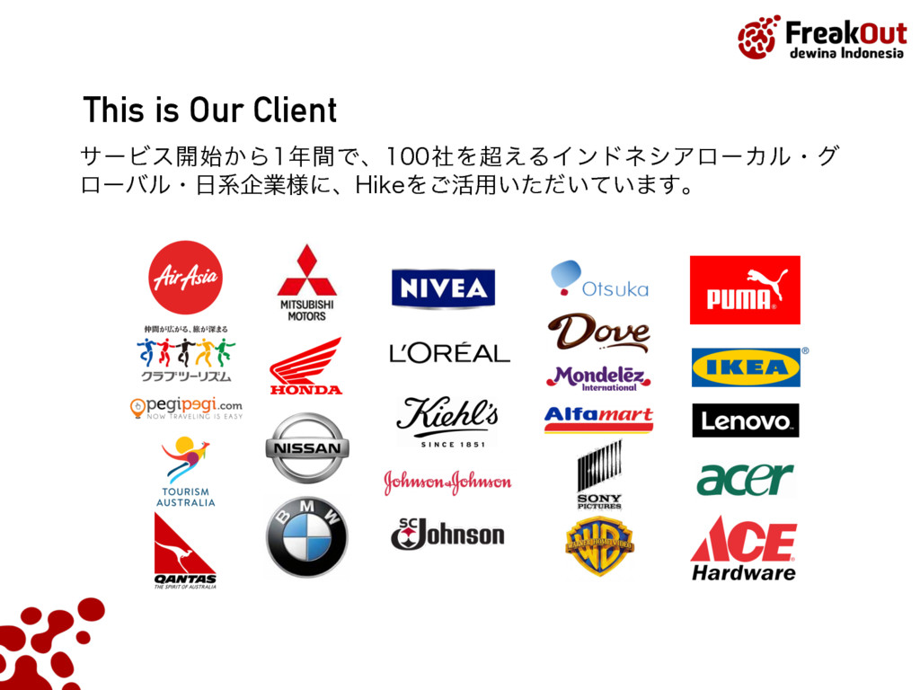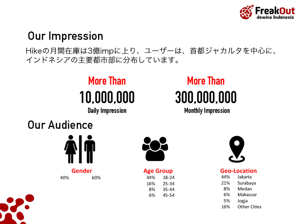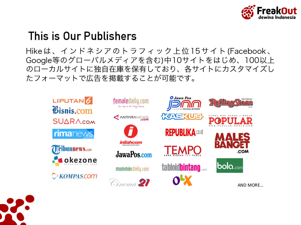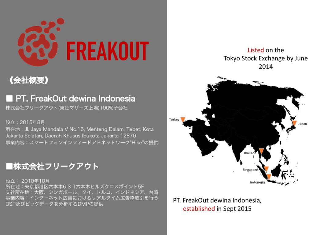 5FCFU ,PUB +BLBSUB4FMBUBO %BFSBI,IVTVT*CVLPUB+BLBSUB ࣄۀ༰ɿεϚʔτϑΥϯΠϯϑΟʔυΞυωοτϫʔΫz)JLFzͷఏڙ ˙גࣜձࣾϑϦʔΫΞτ ઃཱɿ ݄ ॴࡏɿ౦ژߓ۠ຊຊώϧζΫϩεϙΠϯτ' ࢧࣾॴࡏɿେࡕɺγϯΨϙʔϧɺλΠɺτϧίɺΠϯυωγΞɺ ࣄۀ༰ɿΠϯλʔωοτࠂʹ͓͚ΔϦΞϧλΠϜࠂऔҾΛߦ͏ %41ٴͼϏοάσʔλΛੳ͢Δ%.1ͷఏڙ Listed on the Tokyo Stock Exchange by June 2014 PT. FreakOut dewina Indonesia, established in Sept 2015 Japan Indonesia Thailand Singapore Turkey