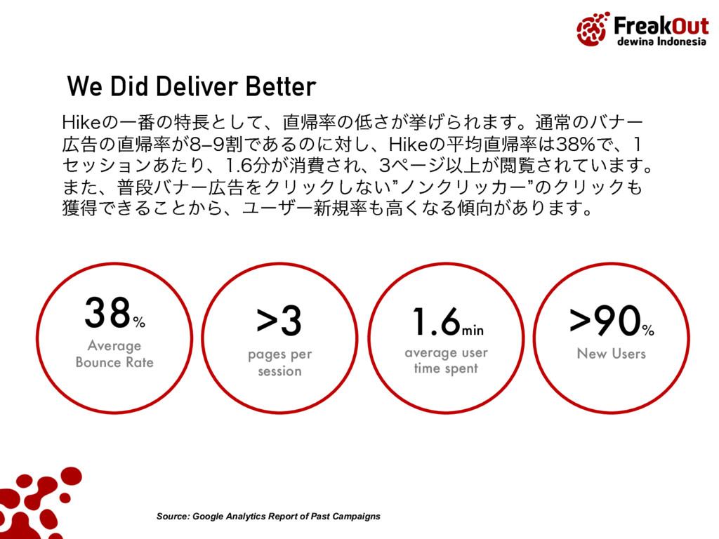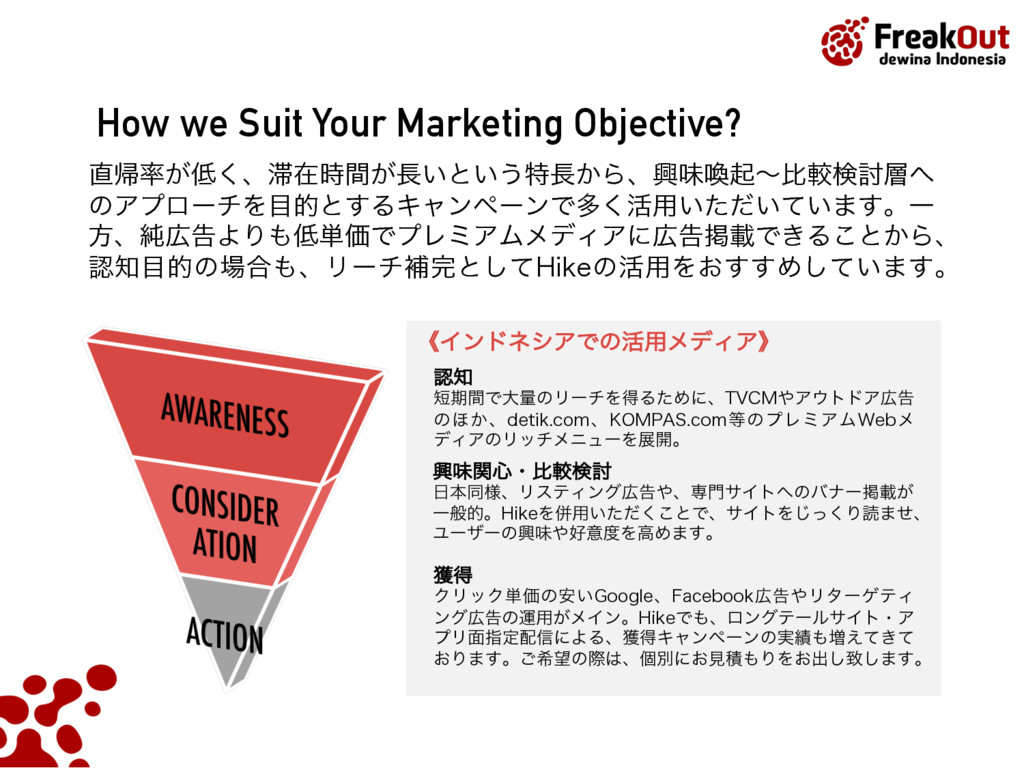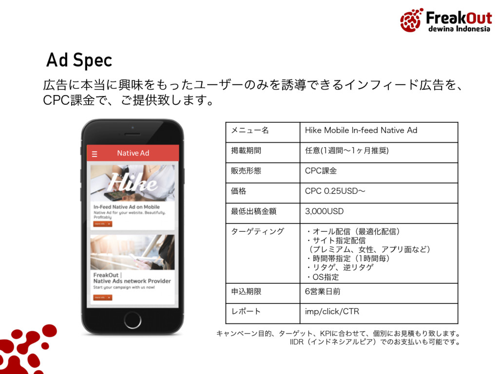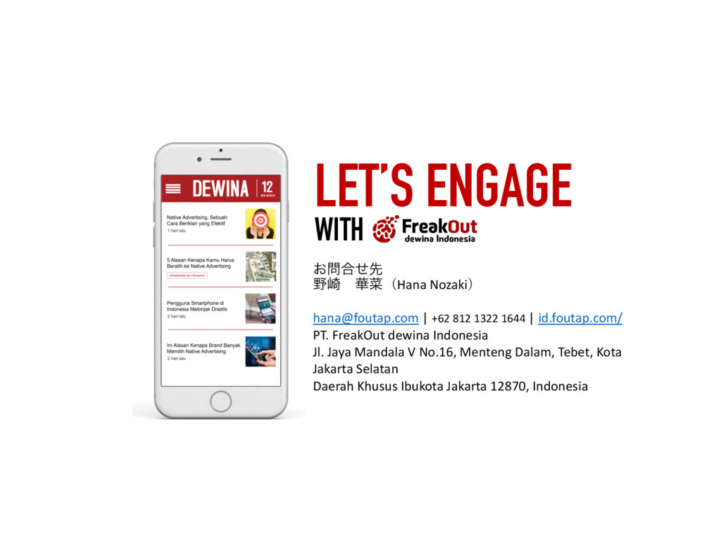 5FCFU ,PUB +BLBSUB4FMBUBO %BFSBI,IVTVT*CVLPUB+BLBSUB ࣄۀ༰ɿεϚʔτϑΥϯΠϯϑΟʔυΞυωοτϫʔΫz)JLFzͷఏڙ ˙גࣜձࣾϑϦʔΫΞτ ઃཱɿ ݄ ॴࡏɿ౦ژߓ۠ຊຊώϧζΫϩεϙΠϯτ' ࢧࣾॴࡏɿେࡕɺγϯΨϙʔϧɺλΠɺτϧίɺΠϯυωγΞɺ ࣄۀ༰ɿΠϯλʔωοτࠂʹ͓͚ΔϦΞϧλΠϜࠂऔҾΛߦ͏ %41ٴͼϏοάσʔλΛੳ͢Δ%.1ͷఏڙ Listed on the Tokyo Stock Exchange by June 2014 PT. FreakOut dewina Indonesia, established in Sept 2015 Japan Indonesia Thailand Singapore Turkey