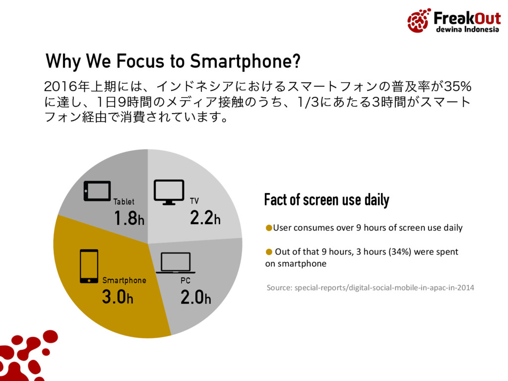 screen use daily Source: special-reports/digital-social-mobile-in-apac-in-2014 TV 2.2h PC 2.0h Smartphone 3.0h •User consumes over 9 hours of screen use daily • Out of that 9 hours, 3 hours (34%) were spent on smartphone Tablet 1.8h