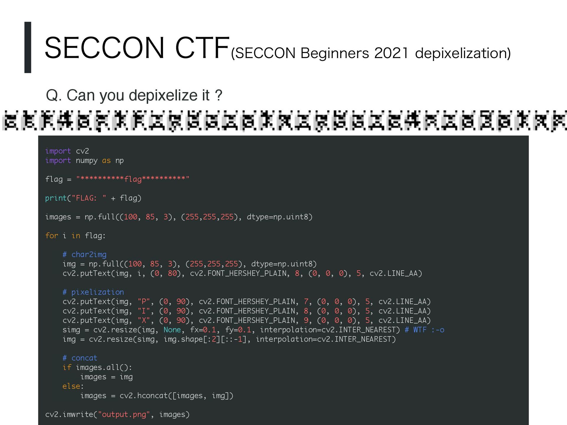 import numpy as np flag = "**********flag**********" print("FLAG: " + flag) images = np.full((100, 85, 3), (255,255,255), dtype=np.uint8) for i in flag: # char2img img = np.full((100, 85, 3), (255,255,255), dtype=np.uint8) cv2.putText(img, i, (0, 80), cv2.FONT_HERSHEY_PLAIN, 8, (0, 0, 0), 5, cv2.LINE_AA) # pixelization cv2.putText(img, "P", (0, 90), cv2.FONT_HERSHEY_PLAIN, 7, (0, 0, 0), 5, cv2.LINE_AA) cv2.putText(img, "I", (0, 90), cv2.FONT_HERSHEY_PLAIN, 8, (0, 0, 0), 5, cv2.LINE_AA) cv2.putText(img, "X", (0, 90), cv2.FONT_HERSHEY_PLAIN, 9, (0, 0, 0), 5, cv2.LINE_AA) simg = cv2.resize(img, None, fx=0.1, fy=0.1, interpolation=cv2.INTER_NEAREST) # WTF :-o img = cv2.resize(simg, img.shape[:2][::-1], interpolation=cv2.INTER_NEAREST) # concat if images.all(): images = img else: images = cv2.hconcat([images, img]) cv2.imwrite("output.png", images)