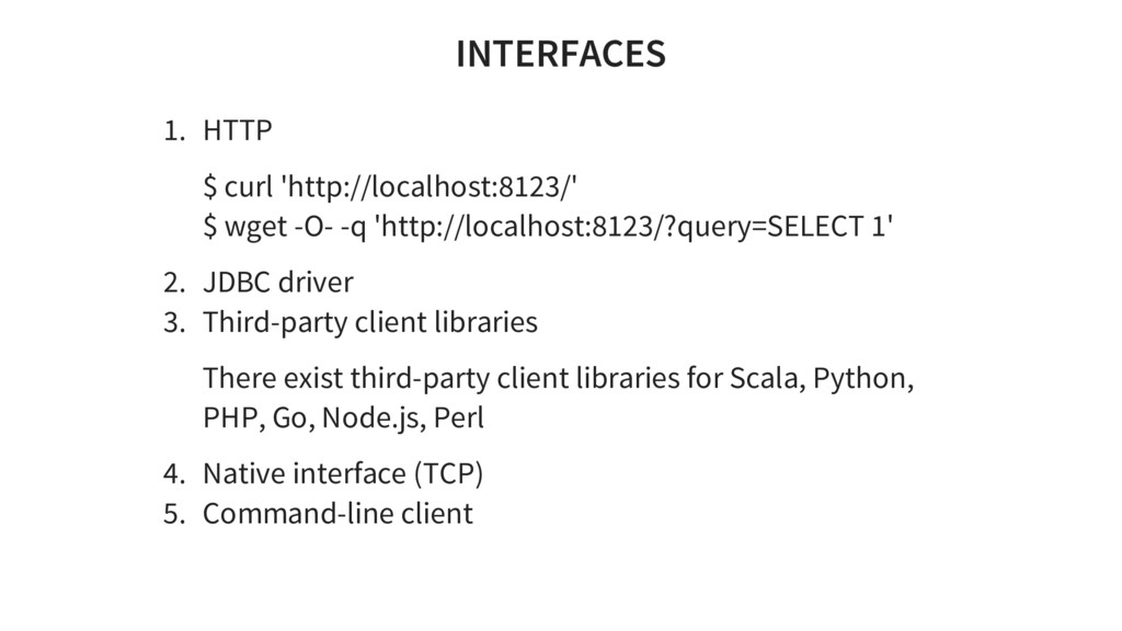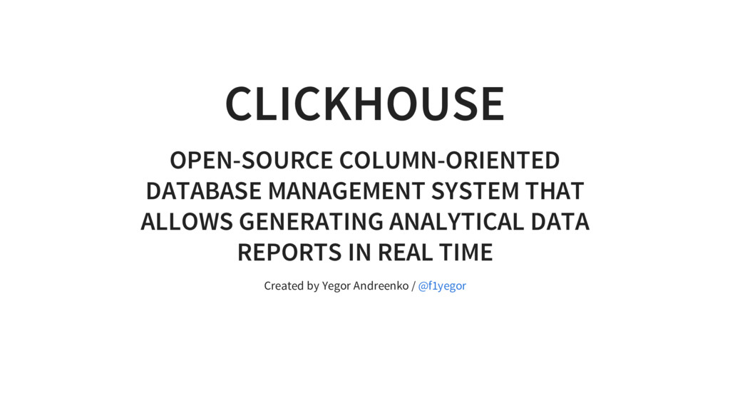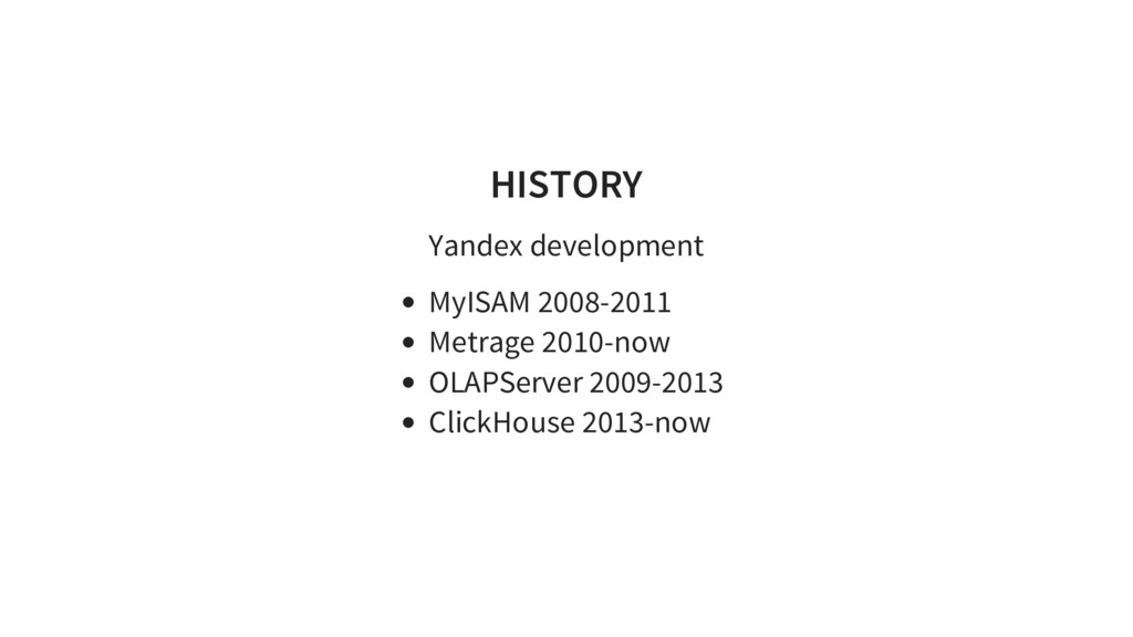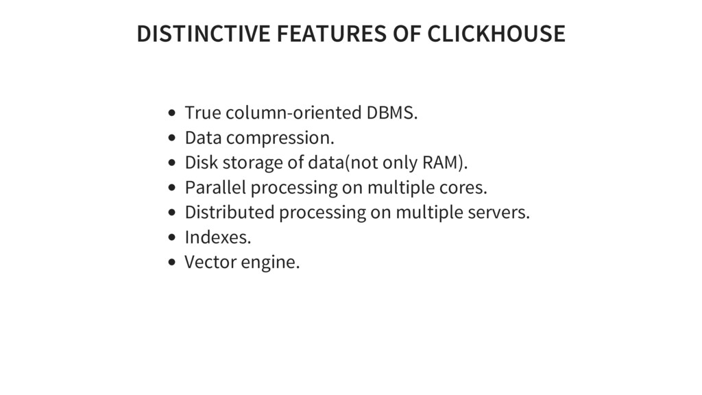 trillion rows(2015) Linear scalability - from 60 to 394 in 2 years, 1 Tb/s of uncompressed data High performance Enough functionality for tools of web analytics. SQL dialect (benchmarks)