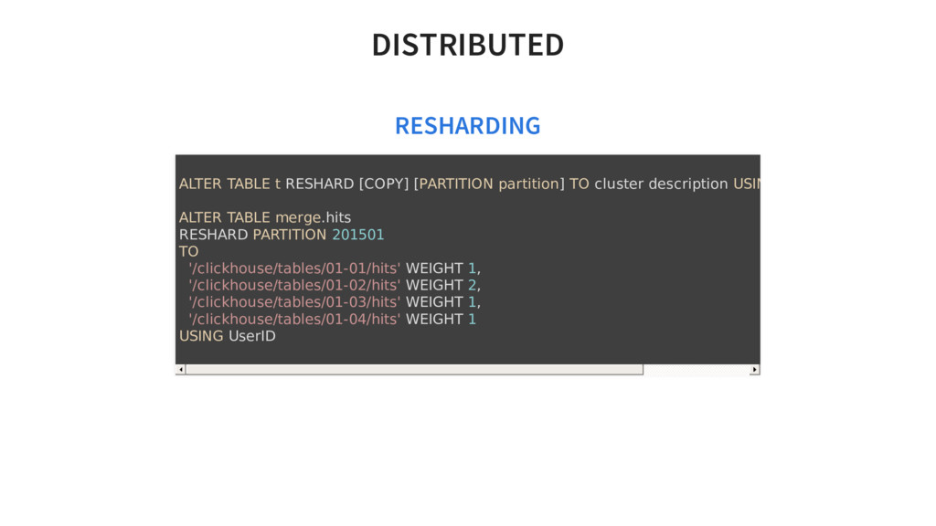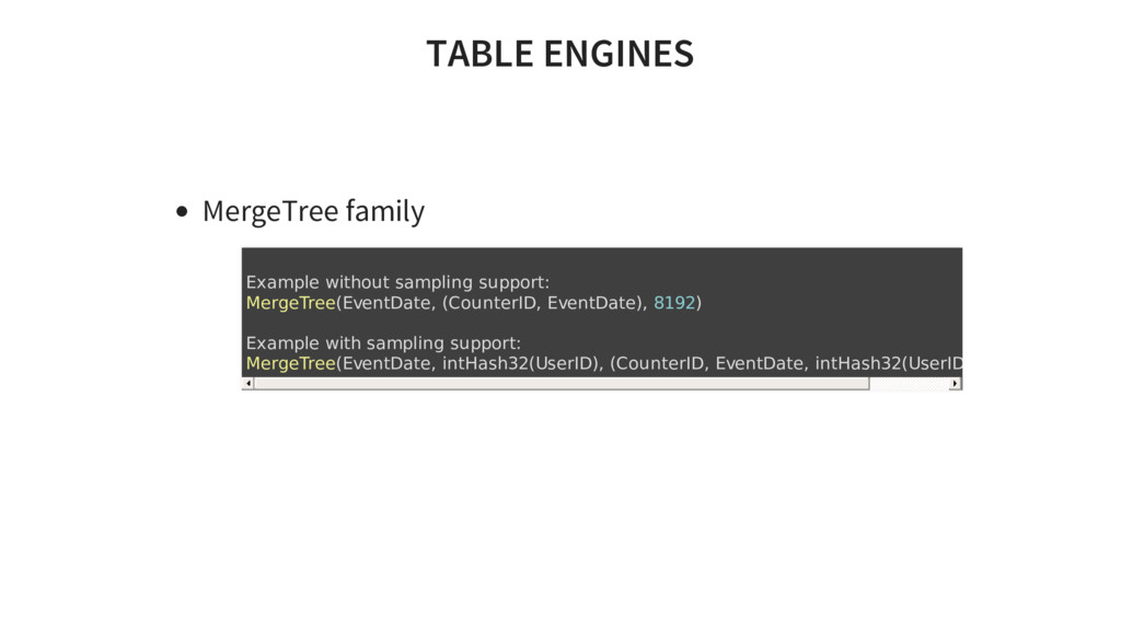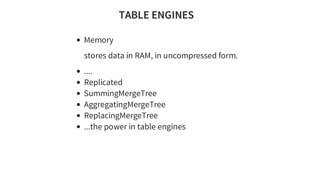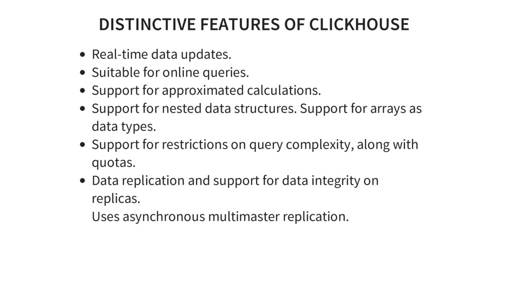 queries. Support for approximated calculations. Support for nested data structures. Support for arrays as data types. Support for restrictions on query complexity, along with quotas. Data replication and support for data integrity on replicas. Uses asynchronous multimaster replication.