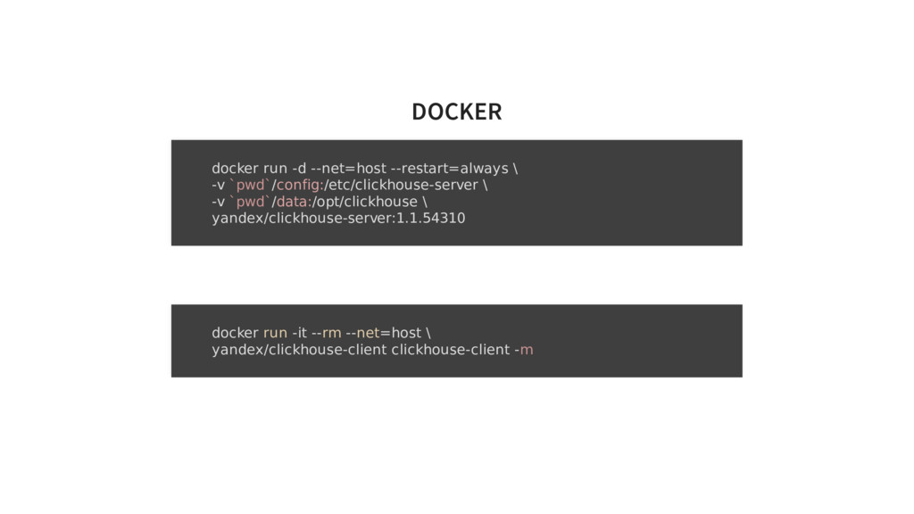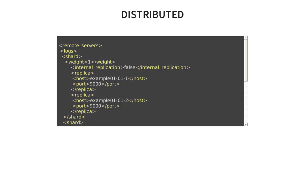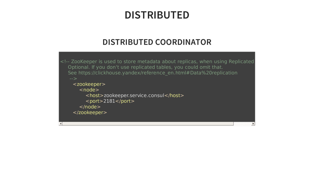 about replicas, when using Replicated tables. Optional. If you don't use replicated tables, you could omit that. See https://clickhouse.yandex/reference_en.html#Data%20replication --> <zookeeper> <node> <host>zookeeper.service.consul</host> <port>2181</port> </node> </zookeeper>