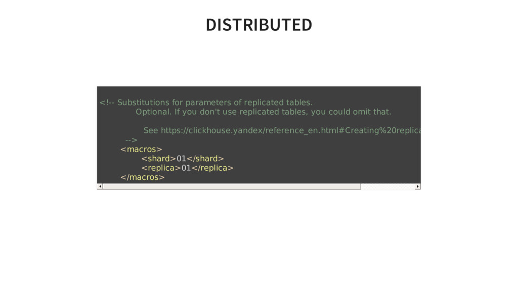 you don't use replicated tables, you could omit that. See https://clickhouse.yandex/reference_en.html#Creating%20replicated%20tables --> <macros> <shard>01</shard> <replica>01</replica> </macros>