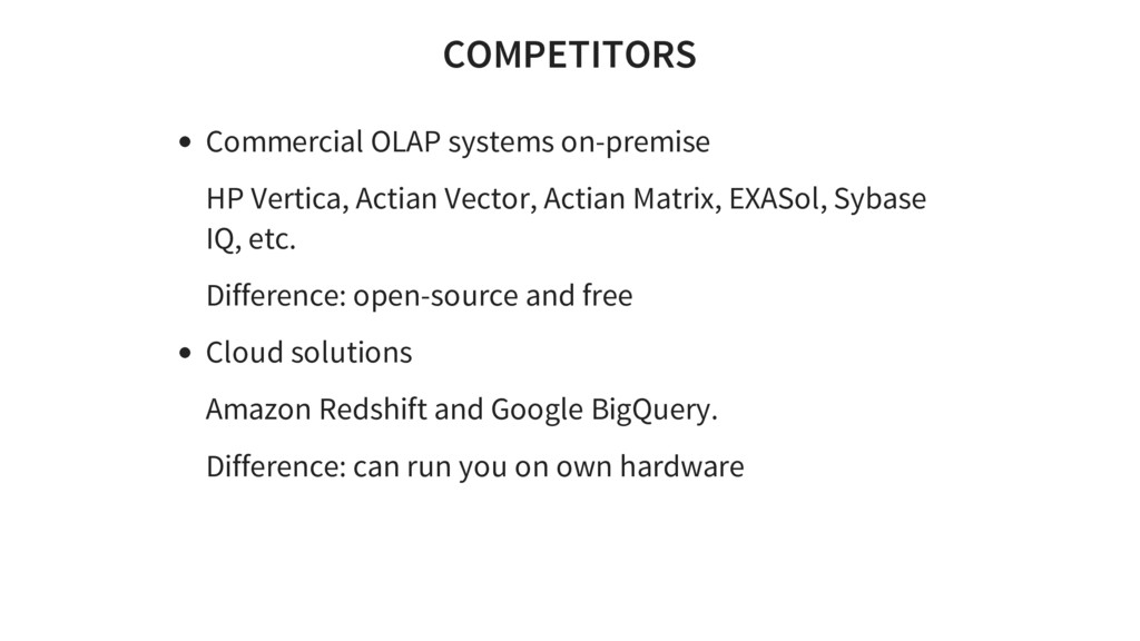 Matrix, EXASol, Sybase IQ, etc. Difference: open-source and free Cloud solutions Amazon Redshift and Google BigQuery. Difference: can run you on own hardware