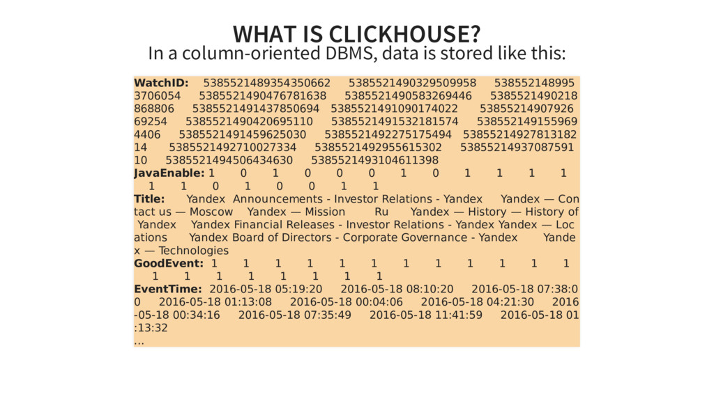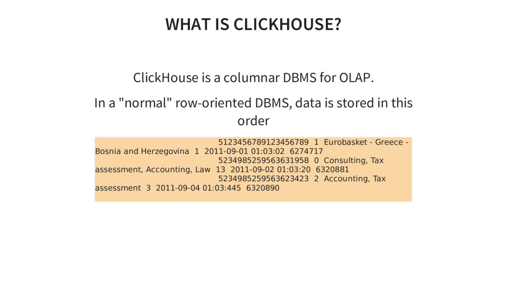 In a "normal" row-oriented DBMS, data is stored in this order 5123456789123456789 1 Eurobasket - Greece - Bosnia and Herzegovina 1 2011-09-01 01:03:02 6274717 5234985259563631958 0 Consulting, Tax assessment, Accounting, Law 13 2011-09-02 01:03:20 6320881 5234985259563623423 2 Accounting, Tax assessment 3 2011-09-04 01:03:445 6320890