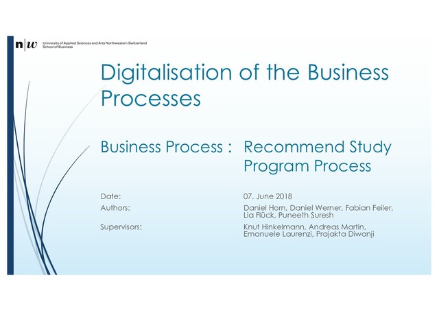 Program Process Date: 07. June 2018 Authors: Daniel Horn, Daniel Werner, Fabian Feiler, Lia Flück, Puneeth Suresh Supervisors: Knut Hinkelmann, Andreas Martin, Emanuele Laurenzi, Prajakta Diwanji