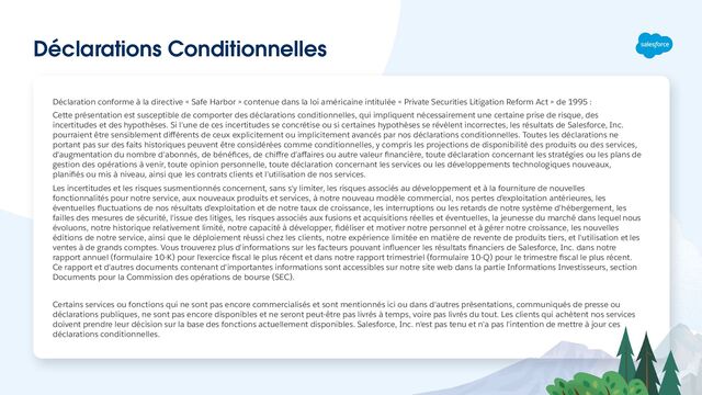 » contenue dans la loi américaine intitulée « Private Securities Litigation Reform Act » de 1995 : Cette présentation est susceptible de comporter des déclarations conditionnelles, qui impliquent nécessairement une certaine prise de risque, des incertitudes et des hypothèses. Si l'une de ces incertitudes se concrétise ou si certaines hypothèses se révèlent incorrectes, les résultats de Salesforce, Inc. pourraient être sensiblement différents de ceux explicitement ou implicitement avancés par nos déclarations conditionnelles. Toutes les déclarations ne portant pas sur des faits historiques peuvent être considérées comme conditionnelles, y compris les projections de disponibilité des produits ou des services, d'augmentation du nombre d'abonnés, de bénéfices, de chiffre d'affaires ou autre valeur financière, toute déclaration concernant les stratégies ou les plans de gestion des opérations à venir, toute opinion personnelle, toute déclaration concernant les services ou les développements technologiques nouveaux, planifiés ou mis à niveau, ainsi que les contrats clients et l'utilisation de nos services. Les incertitudes et les risques susmentionnés concernent, sans s'y limiter, les risques associés au développement et à la fourniture de nouvelles fonctionnalités pour notre service, aux nouveaux produits et services, à notre nouveau modèle commercial, nos pertes d'exploitation antérieures, les éventuelles fluctuations de nos résultats d'exploitation et de notre taux de croissance, les interruptions ou les retards de notre système d'hébergement, les failles des mesures de sécurité, l'issue des litiges, les risques associés aux fusions et acquisitions réelles et éventuelles, la jeunesse du marché dans lequel nous évoluons, notre historique relativement limité, notre capacité à développer, fidéliser et motiver notre personnel et à gérer notre croissance, les nouvelles éditions de notre service, ainsi que le déploiement réussi chez les clients, notre expérience limitée en matière de revente de produits tiers, et l'utilisation et les ventes à de grands comptes. Vous trouverez plus d'informations sur les facteurs pouvant influencer les résultats financiers de Salesforce, Inc. dans notre rapport annuel (formulaire 10-K) pour l'exercice fiscal le plus récent et dans notre rapport trimestriel (formulaire 10-Q) pour le trimestre fiscal le plus récent. Ce rapport et d'autres documents contenant d'importantes informations sont accessibles sur notre site web dans la partie Informations Investisseurs, section Documents pour la Commission des opérations de bourse (SEC). Certains services ou fonctions qui ne sont pas encore commercialisés et sont mentionnés ici ou dans d'autres présentations, communiqués de presse ou déclarations publiques, ne sont pas encore disponibles et ne seront peut-être pas livrés à temps, voire pas livrés du tout. Les clients qui achètent nos services doivent prendre leur décision sur la base des fonctions actuellement disponibles. Salesforce, Inc. n'est pas tenu et n'a pas l'intention de mettre à jour ces déclarations conditionnelles.