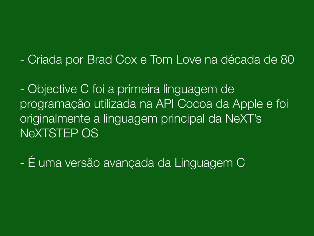 de 80 - Objective C foi a primeira linguagem de programação utilizada na API Cocoa da Apple e foi originalmente a linguagem principal da NeXT’s NeXTSTEP OS - É uma versão avançada da Linguagem C