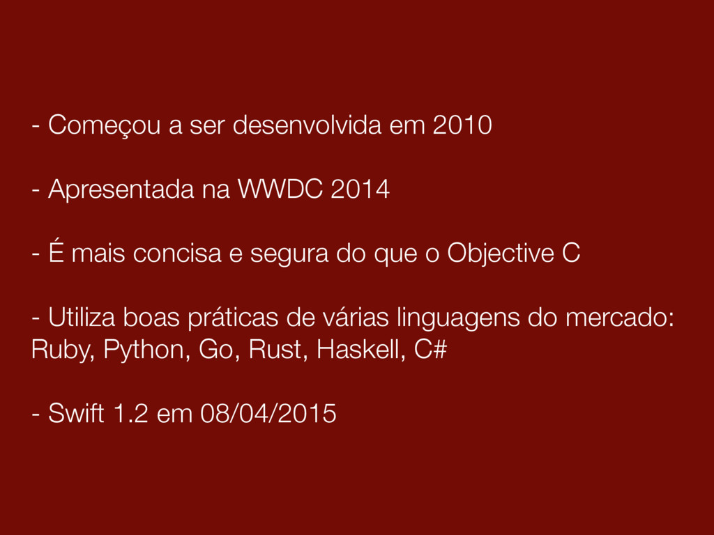 WWDC 2014 - É mais concisa e segura do que o Objective C - Utiliza boas práticas de várias linguagens do mercado: Ruby, Python, Go, Rust, Haskell, C# - Swift 1.2 em 08/04/2015