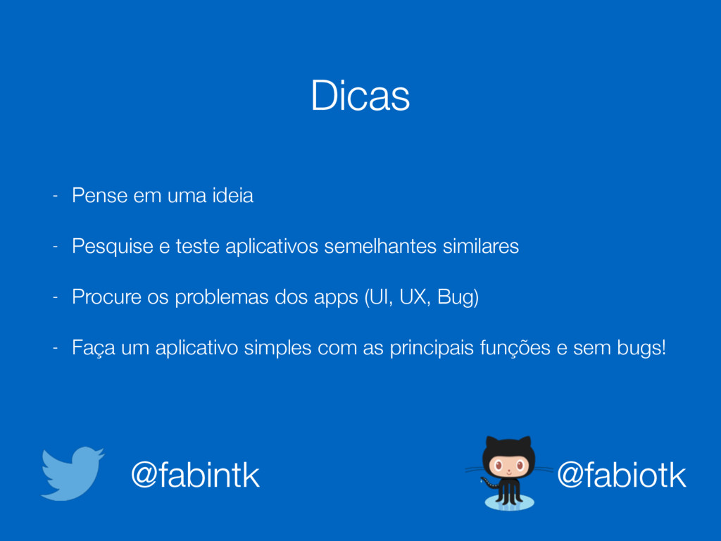 teste aplicativos semelhantes similares - Procure os problemas dos apps (UI, UX, Bug) - Faça um aplicativo simples com as principais funções e sem bugs! Dicas