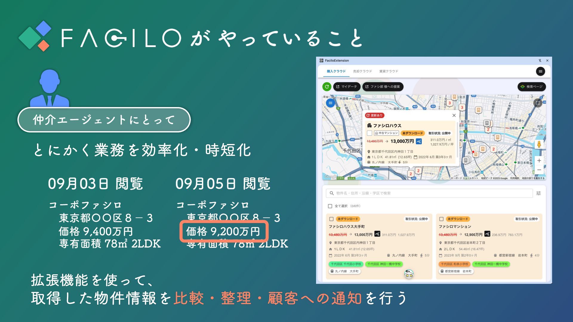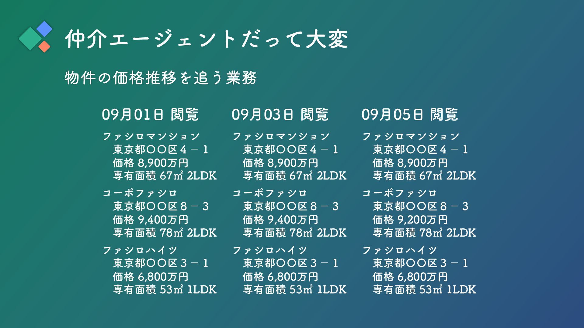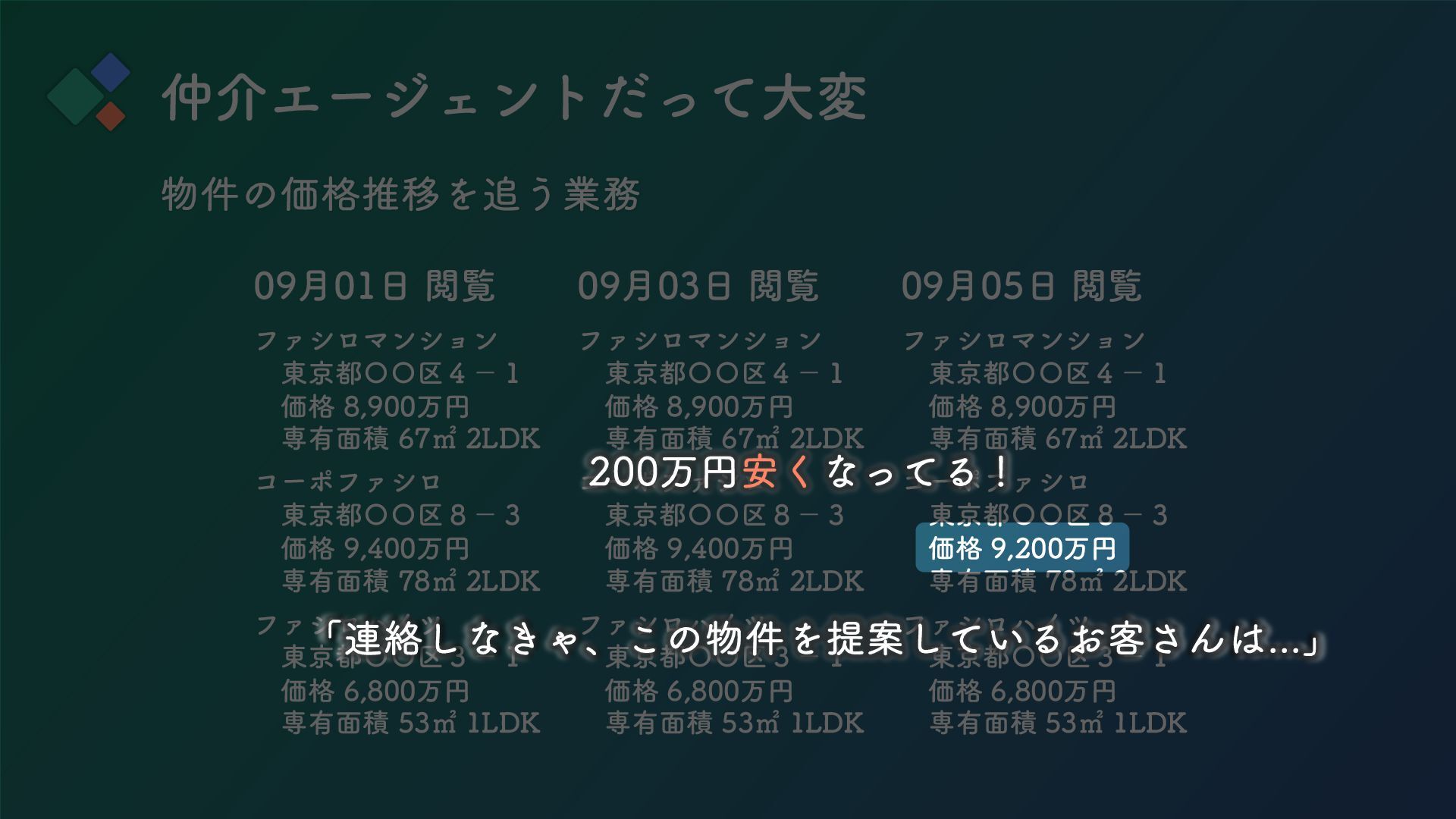3. ͱʹ͔͘ۀ຿Λޮ཰Խɾ࣌୹Խ ͕ ΍͍ͬͯΔ͜ͱ ஥հΤʔδΣϯτʹͱͬͯ ֦ுػೳΛ࢖ͬͯɺ औಘͨ͠෺݅৘ใΛൺֱɾ੔ཧɾސ٬΁ͷ௨஌Λߦ͏ ݄೔ Ӿཡ ݄೔ Ӿཡ