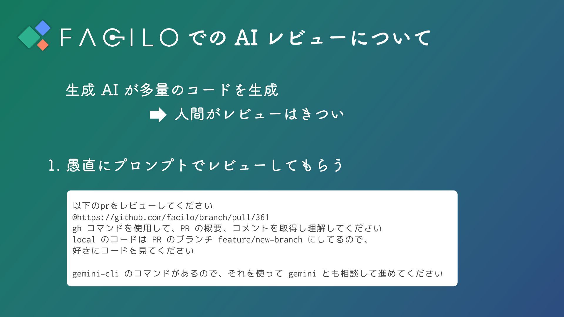 4. Ͱͷ "*ϨϏϡʔʹ͍ͭͯ ੜ੒"*͕ଟྔͷίʔυΛੜ੒ ਓ͕ؒϨϏϡʔ͸͖͍ͭ ۪௚ʹϓϩϯϓτͰϨϏϡʔͯ͠΋Β͏ 以下のprをレビューしてください @https://github.com/facilo/branch/pull/361 gh コマンドを使用して、PR の概要、コメントを取得し理解してください