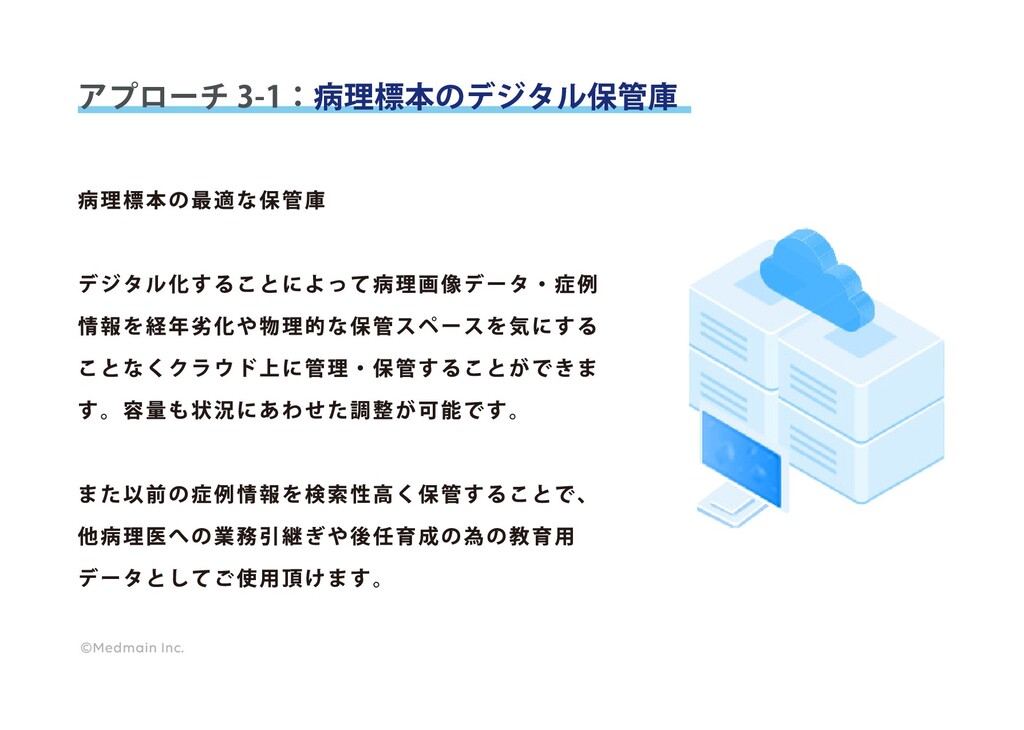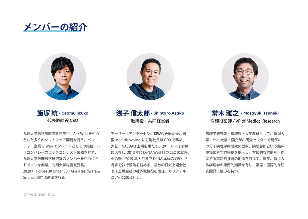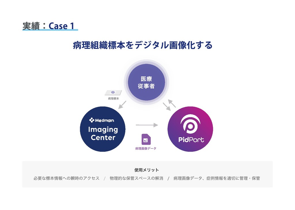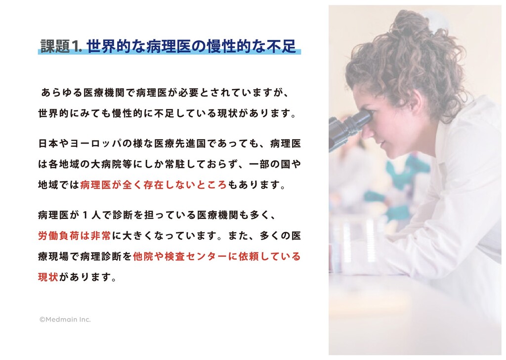 メドメインは、世界中の医療従事者のパートナーとして、AI/Deep Learningを用い病理画像診断の解析システム「PidPort」の開発・運営を行う、Med-Tech Startupです。