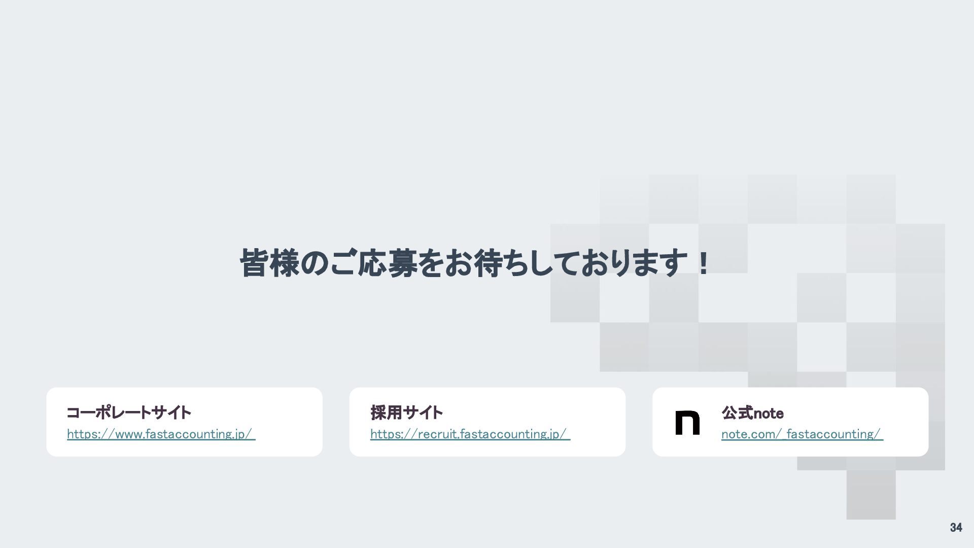 皆様のご応募をお待ちしております! 34 公式note note.com/_fastaccounting/ 採用サイト https://recruit.fastaccounting.jp/ コーポレートサイト