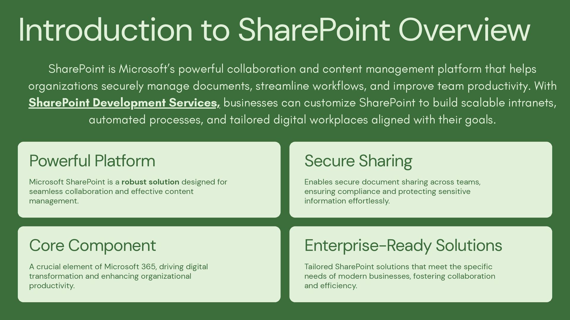 seamless collaboration and effective content management. Core Component A crucial element of Microsoft 365, driving digital transformation and enhancing organizational productivity. Secure Sharing Enables secure document sharing across teams, ensuring compliance and protecting sensitive information effortlessly. Enterprise-Ready Solutions Tailored SharePoint solutions that meet the specific needs of modern businesses, fostering collaboration and efficiency. Introduction to SharePoint Overview SharePoint is Microsoft’s powerful collaboration and content management platform that helps organizations securely manage documents, streamline workflows, and improve team productivity. With SharePoint Development Services, businesses can customize SharePoint to build scalable intranets, automated processes, and tailored digital workplaces aligned with their goals.