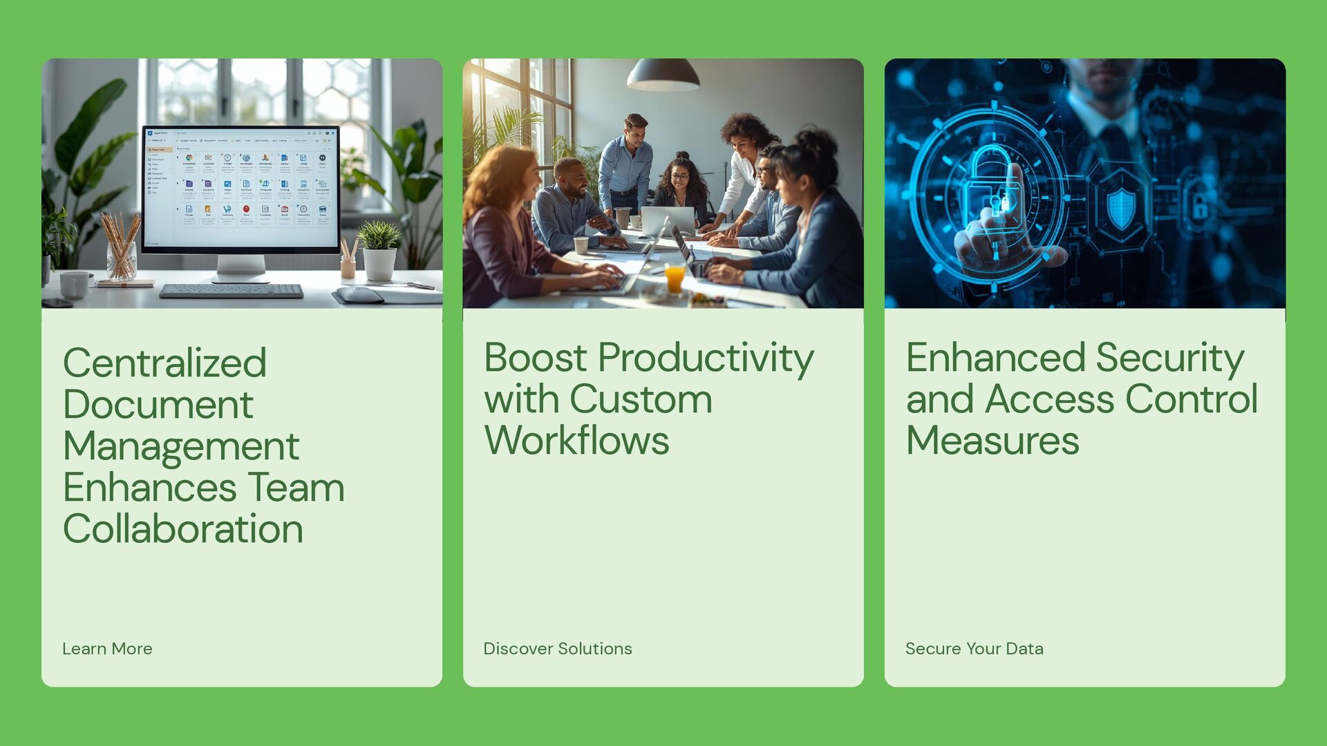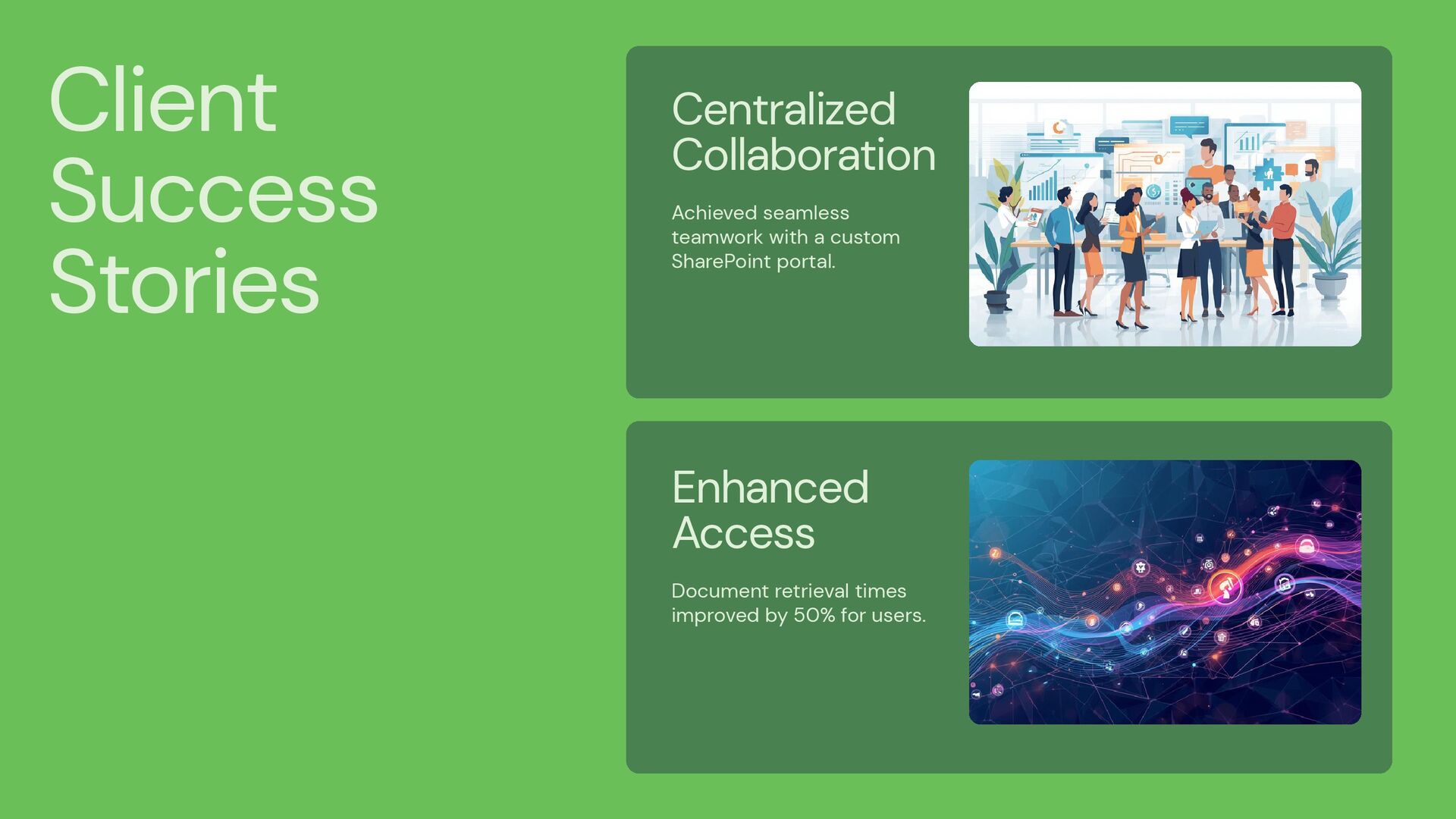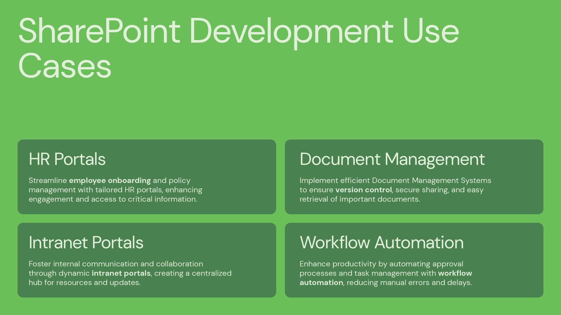 HR portals, enhancing engagement and access to critical information. Intranet Portals Foster internal communication and collaboration through dynamic intranet portals, creating a centralized hub for resources and updates. Document Management Implement efficient Document Management Systems to ensure version control, secure sharing, and easy retrieval of important documents. Workflow Automation Enhance productivity by automating approval processes and task management with workflow automation, reducing manual errors and delays. SharePoint Development Use Cases