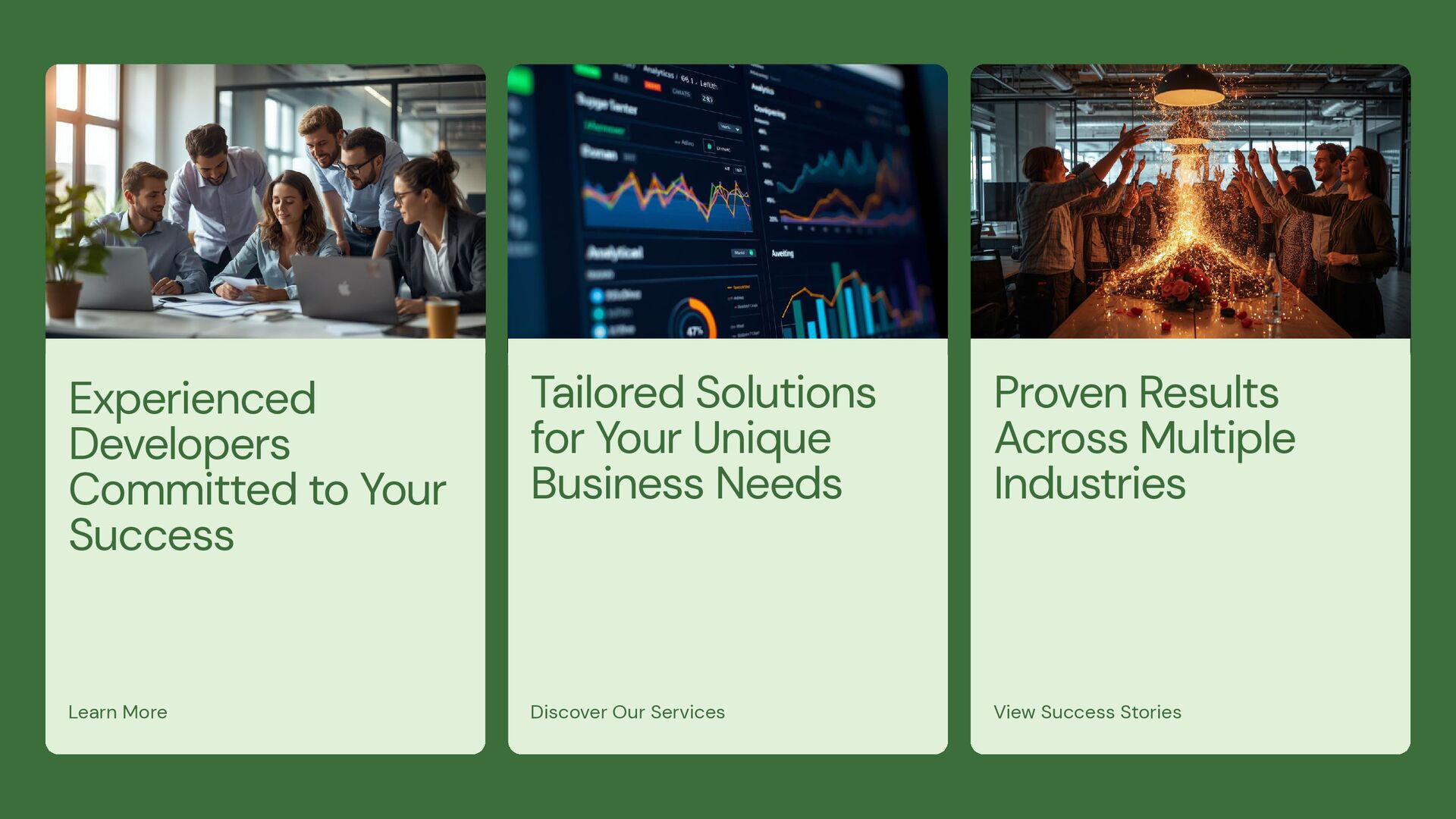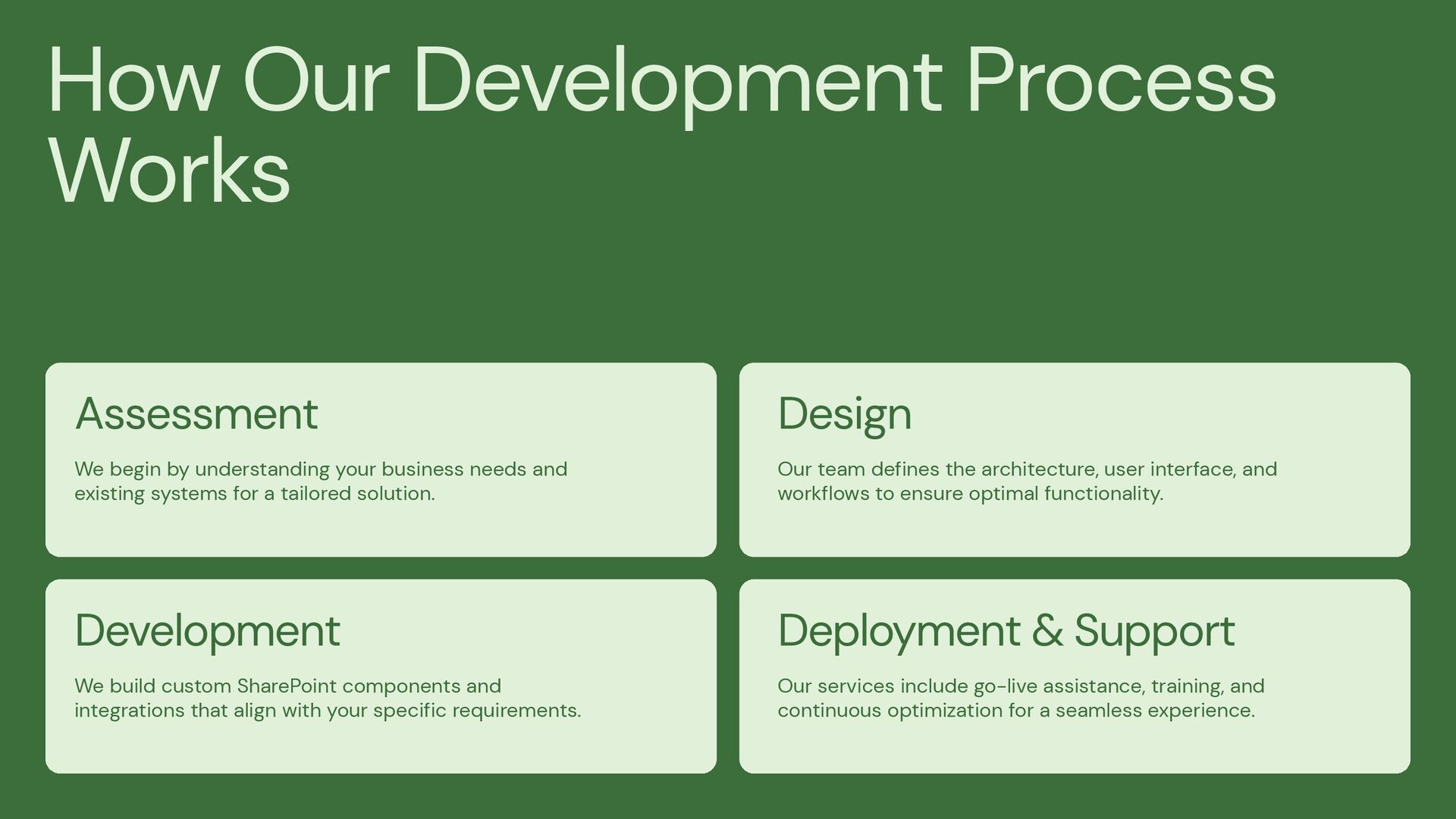 systems for a tailored solution. Development We build custom SharePoint components and integrations that align with your specific requirements. Design Our team defines the architecture, user interface, and workflows to ensure optimal functionality. Deployment & Support Our services include go-live assistance, training, and continuous optimization for a seamless experience. How Our Development Process Works