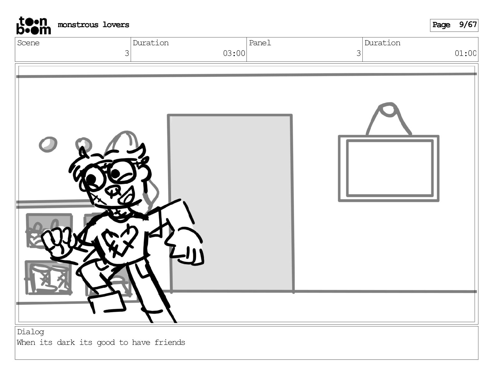 Scene 9 Duration 05:00 Panel 3 Duration 01:00 Dialog or