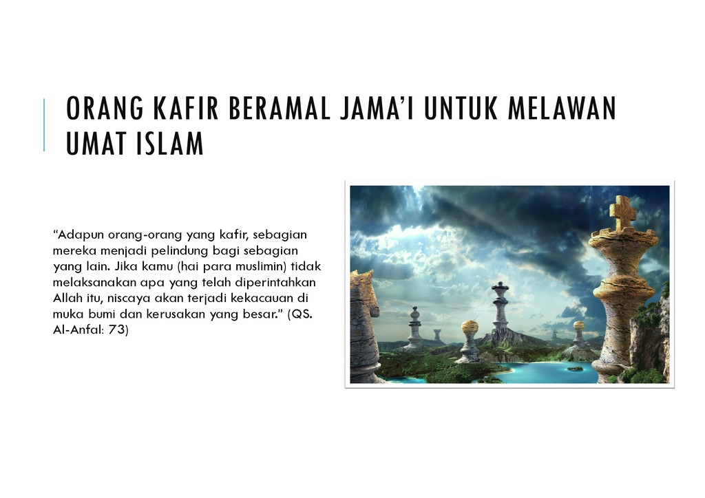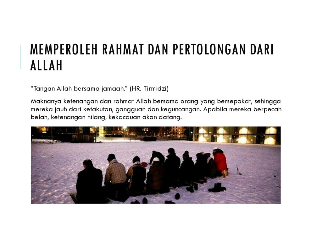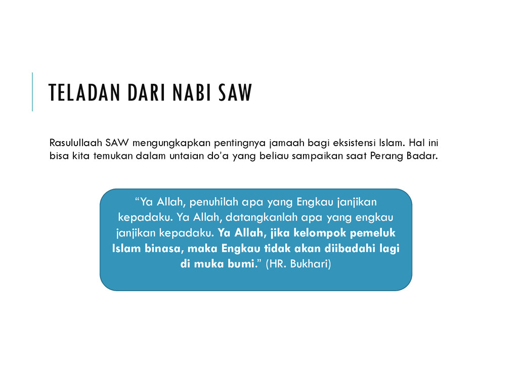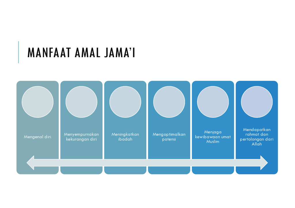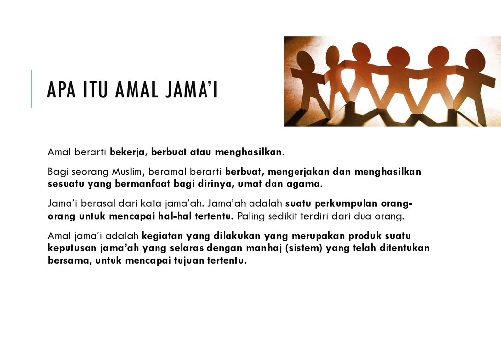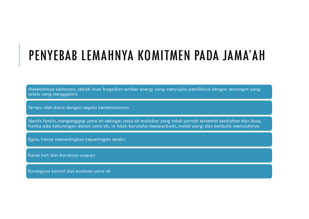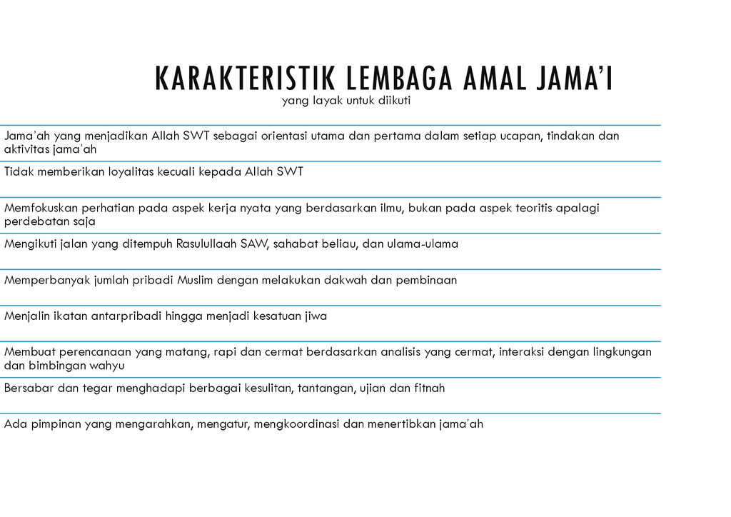 orientasi utama dan pertama dalam setiap ucapan, tindakan dan aktivitas jama’ah Tidak memberikan loyalitas kecuali kepada Allah SWT Memfokuskan perhatian pada aspek kerja nyata yang berdasarkan ilmu, bukan pada aspek teoritis apalagi perdebatan saja Mengikuti jalan yang ditempuh Rasulullaah SAW, sahabat beliau, dan ulama-ulama Memperbanyak jumlah pribadi Muslim dengan melakukan dakwah dan pembinaan Menjalin ikatan antarpribadi hingga menjadi kesatuan jiwa Membuat perencanaan yang matang, rapi dan cermat berdasarkan analisis yang cermat, interaksi dengan lingkungan dan bimbingan wahyu Bersabar dan tegar menghadapi berbagai kesulitan, tantangan, ujian dan fitnah Ada pimpinan yang mengarahkan, mengatur, mengkoordinasi dan menertibkan jama’ah yang layak untuk diikuti