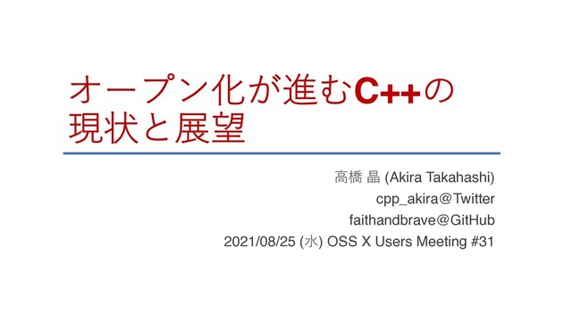 オープン化が進むC++の 現状と展望 ⾼橋 晶 (Akira Takahashi) cpp_akira@Twitter faithandbrave@GitHub 2021/08/25 (⽔)