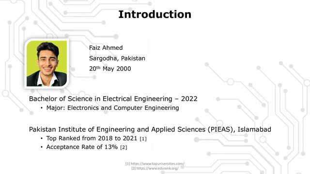 Science in Electrical Engineering – 2022 • Major: Electronics and Computer Engineering Pakistan Institute of Engineering and Applied Sciences (PIEAS), Islamabad • Top Ranked from 2018 to 2021 [1] • Acceptance Rate of 13% [2] [1] https://www.topuniversities.com/ [2] https://www.edurank.org/
