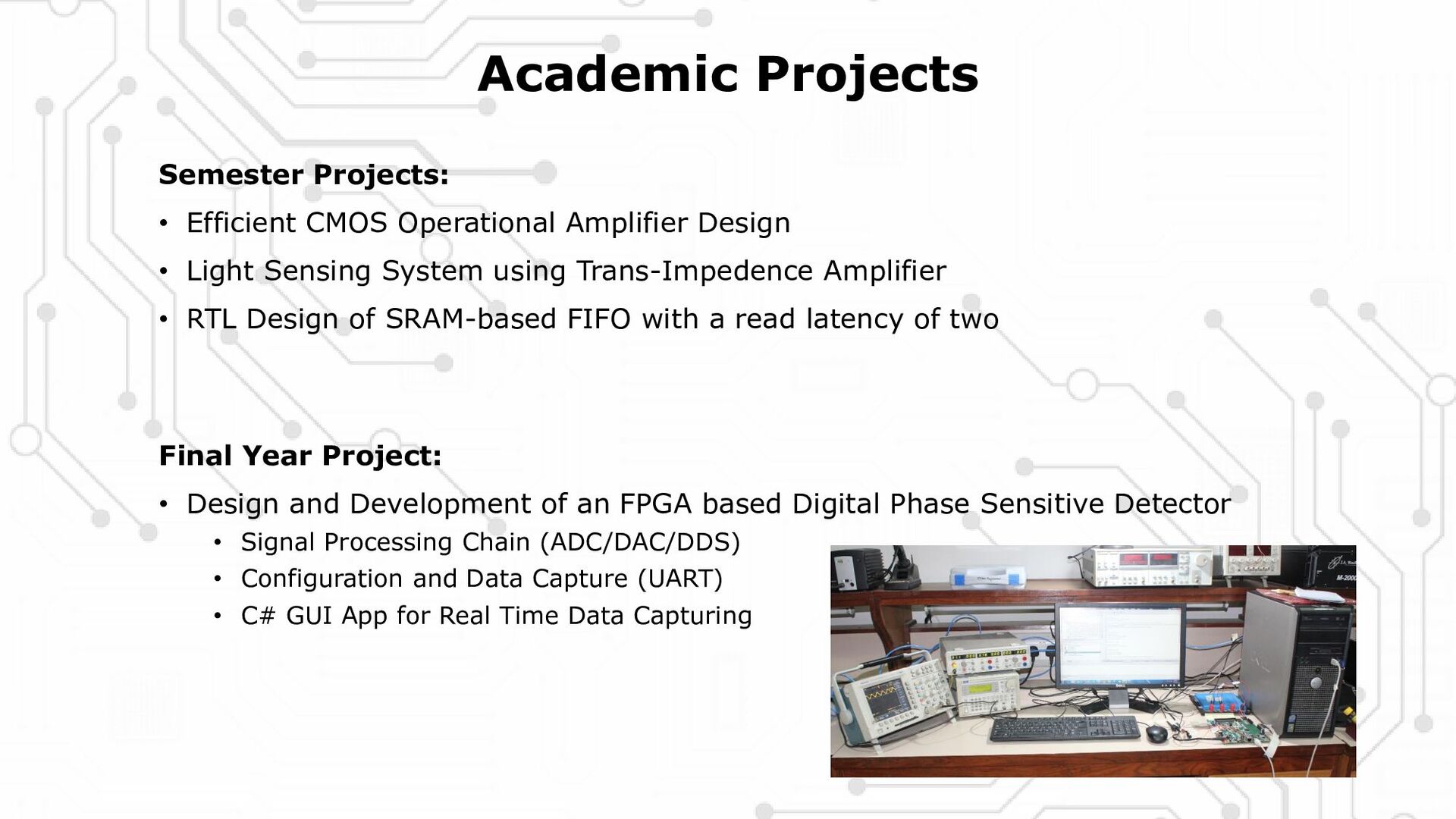 an FPGA based Digital Phase Sensitive Detector • Signal Processing Chain (ADC/DAC/DDS) • Configuration and Data Capture (UART) • C# GUI App for Real Time Data Capturing Semester Projects: • Efficient CMOS Operational Amplifier Design • Light Sensing System using Trans-Impedence Amplifier • RTL Design of SRAM-based FIFO with a read latency of two