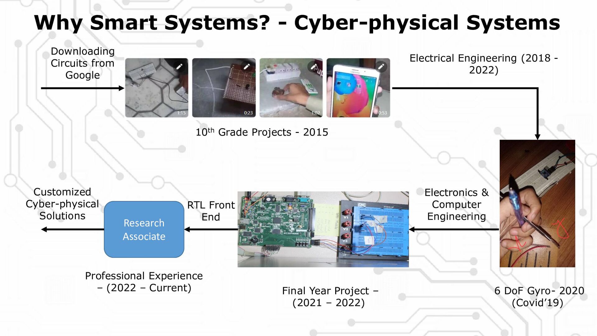 2015 Downloading Circuits from Google 6 DoF Gyro- 2020 (Covid’19) Electrical Engineering (2018 - 2022) Electronics & Computer Engineering Final Year Project – (2021 – 2022) Research Associate RTL Front End Professional Experience – (2022 – Current) Customized Cyber-physical Solutions