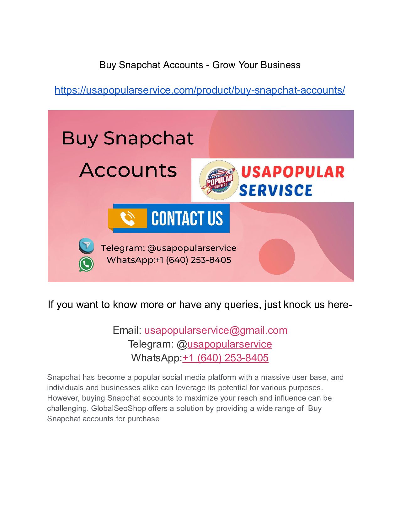want to know more or have any queries, just knock us here- Email: [email protected] Telegram: @usapopularservice WhatsApp:+1 (640) 253-8405 Snapchat has become a popular social media platform with a massive user base, and individuals and businesses alike can leverage its potential for various purposes. However, buying Snapchat accounts to maximize your reach and influence can be challenging. GlobalSeoShop offers a solution by providing a wide range of Buy Snapchat accounts for purchase