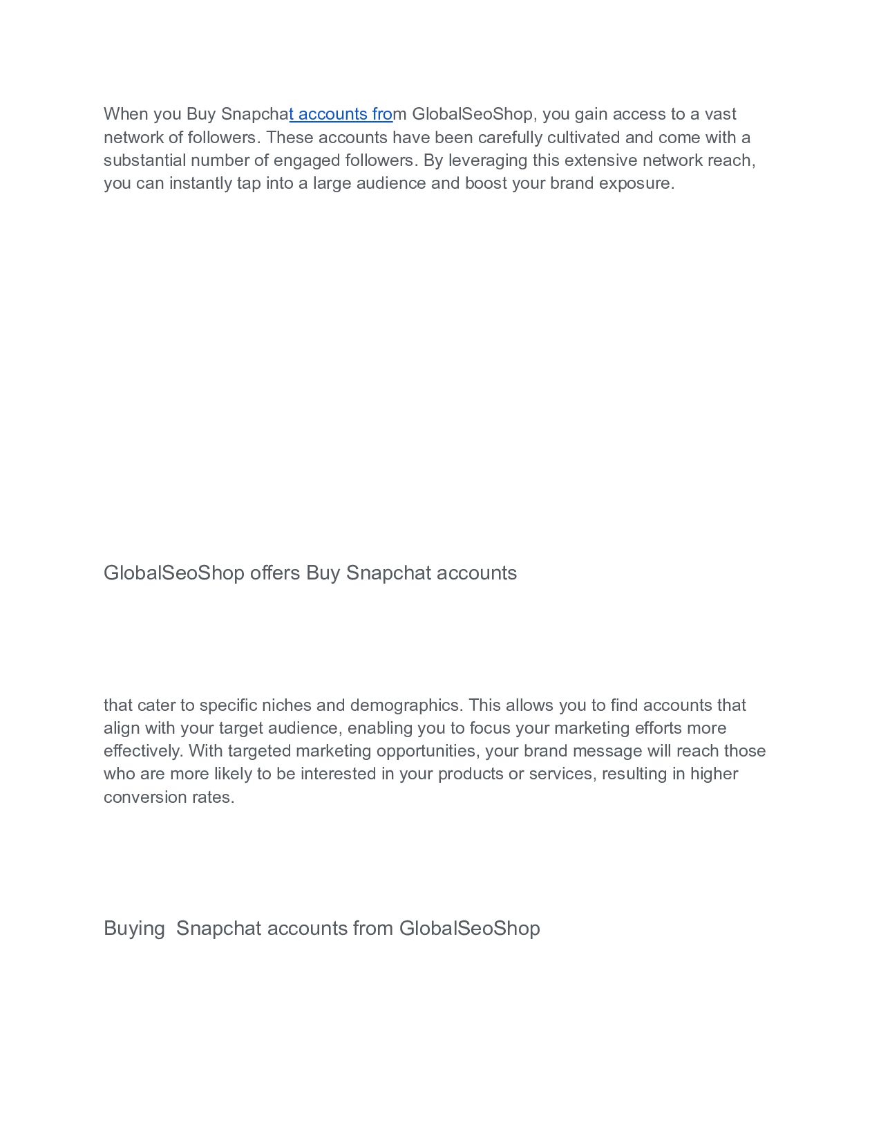 to a vast network of followers. These accounts have been carefully cultivated and come with a substantial number of engaged followers. By leveraging this extensive network reach, you can instantly tap into a large audience and boost your brand exposure. GlobalSeoShop offers Buy Snapchat accounts that cater to specific niches and demographics. This allows you to find accounts that align with your target audience, enabling you to focus your marketing efforts more effectively. With targeted marketing opportunities, your brand message will reach those who are more likely to be interested in your products or services, resulting in higher conversion rates. Buying Snapchat accounts from GlobalSeoShop
