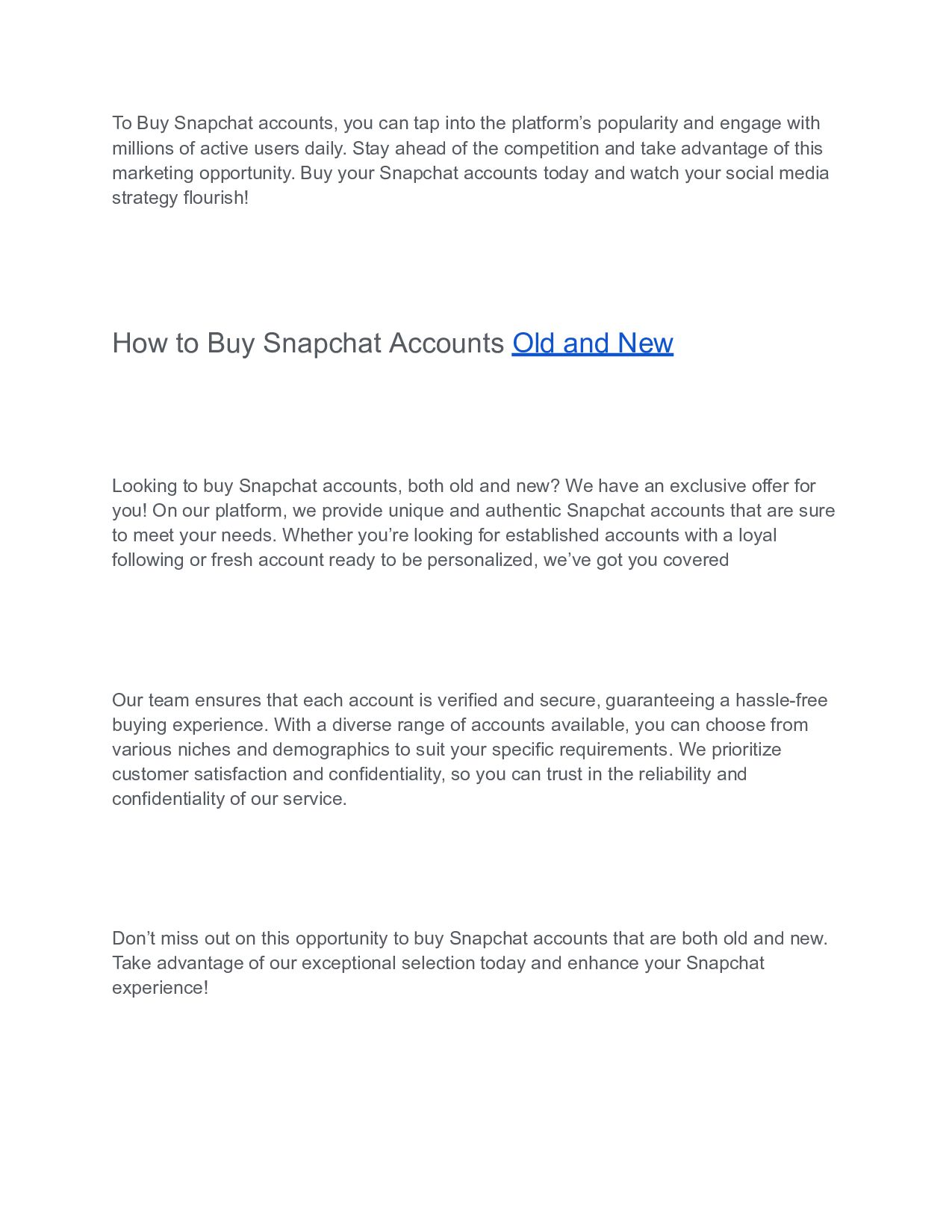 popularity and engage with millions of active users daily. Stay ahead of the competition and take advantage of this marketing opportunity. Buy your Snapchat accounts today and watch your social media strategy flourish! How to Buy Snapchat Accounts Old and New Looking to buy Snapchat accounts, both old and new? We have an exclusive offer for you! On our platform, we provide unique and authentic Snapchat accounts that are sure to meet your needs. Whether you’re looking for established accounts with a loyal following or fresh account ready to be personalized, we’ve got you covered Our team ensures that each account is verified and secure, guaranteeing a hassle-free buying experience. With a diverse range of accounts available, you can choose from various niches and demographics to suit your specific requirements. We prioritize customer satisfaction and confidentiality, so you can trust in the reliability and confidentiality of our service. Don’t miss out on this opportunity to buy Snapchat accounts that are both old and new. Take advantage of our exceptional selection today and enhance your Snapchat experience!