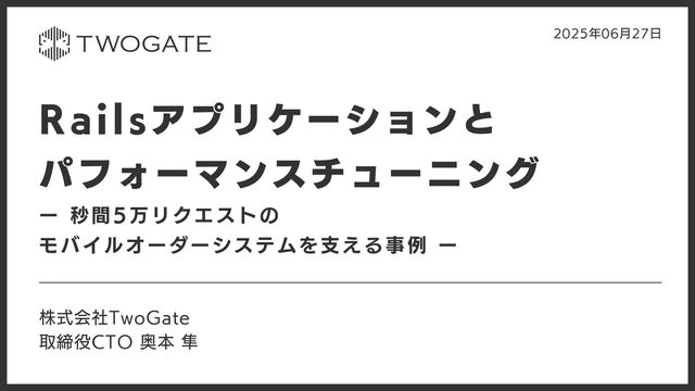 ー シ ョ ン と パ フ ォ ー マ ン ス チ ュ ー ニ ン グ ー 秒 間 5 万 リ ク エ ス ト の モ バ イ ル オ ー ダ ー シ ス テ ム を 支 え る 事 例 ー 株式会社TwoGate 取締役CTO 奥本 隼